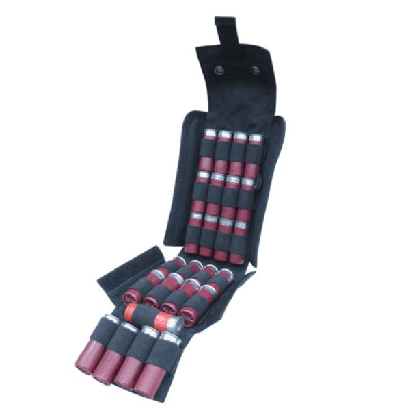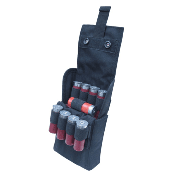 25 Round Shotgun reload pouch. – Fits 25 shells with Hook & Loop plus snap closure. This MOLLE style shotgun pouch fits right on the shotgun scabbard for your convenience! Fits on MOLLE systems. Available in Black