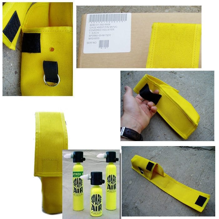 Military or government issue holster for diver’s and airmen’s spare air breathing canisters. This is just the holster, Spare Air canister not included.