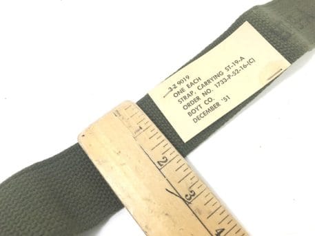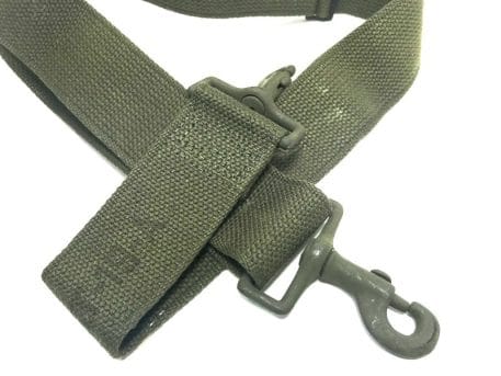 Genuine 50’s date olive drab carrying strap with slide down hooks. 2 inches wide, extends up to 48 inches.