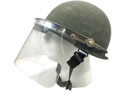 Military helmet riot face shield. Used and abused condition. Easily fits over the M-1 Steel pot. Visors will have MANY scratches and some small cracks.
