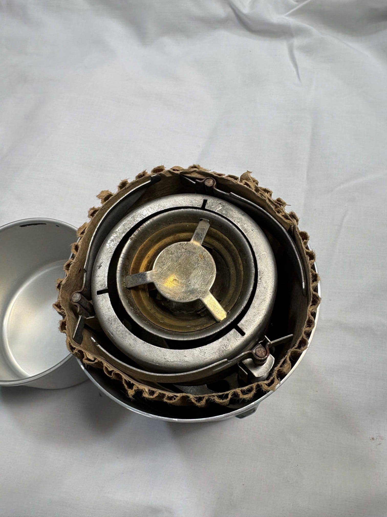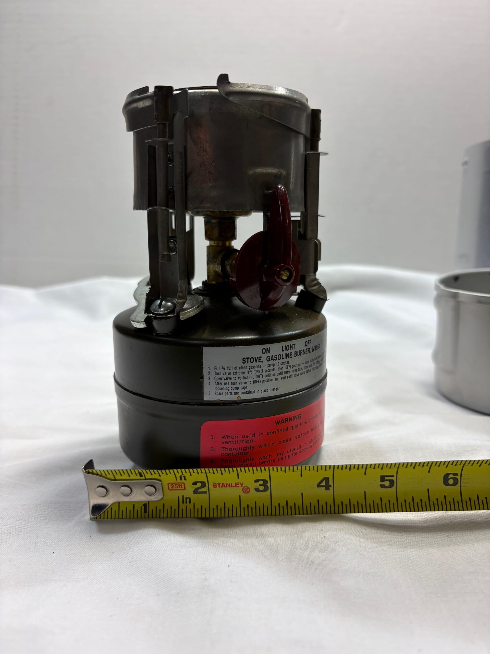 We are offering this stove as military surplus memorabilia that may or may not function as intended. The one-burner M1950 gasoline cooking stove is a cooking and heating unit for a group of from two to five men operating in an isolated or forward area where the use of heavier equipment is not practical. The stove is small, compact, and light, and will operate on either white or leaded gasoline. Best for: Ounce-counting adventurers bound for long trips (5+ days) in a variety of conditions and topography, including high, cold places. Also best for people concerned about the monetary and environmental costs of using canister stoves. Stove is stored in a 2 pc. aluminum container that also functions as a small and large cooking pot.CAUTION: Sold as military memorabilia, may or may not function. More than likely because of the age, seals and gaskets will need to be replaced. sometimes the stove will leak at first and then as the seals soak in more liquid, it will ” seat-up” better. But Remember Buyer Beware! We are offering AS IS. No Refunds or Exchanges on these.