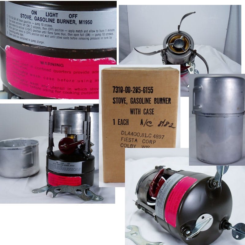 We are offering these as military surplus memorabilia that may or may not function as intended. The one-burner M1950 gasoline cooking stove is a cooking and heating unit for a group of from two to five men operating in an isolated or forward area where the use of heavier equipment is not practical. The stove is small, compact, and light, and will operate on either white or leaded gasoline. Best for: Ounce-counting adventurers bound for long trips (5+ days) in a variety of conditions and topography, including high, cold places. Also best for people concerned about the monetary and environmental costs of using canister stoves. The stove is stored in a 2 pc. aluminum container that also functions as a small and large cooking pot CAUTION: Sold as military memorabilia, may or may not function. More than likely because of the age, seals and gaskets will need to be replaced. sometimes the stoves will leak at first and then ,as the seals soak in more liquid, they will ” seat-up” better. But Remember Buyer Beware! We are offering these AS IS. No Refunds or Exchanges on these. Dated in the 1980’s