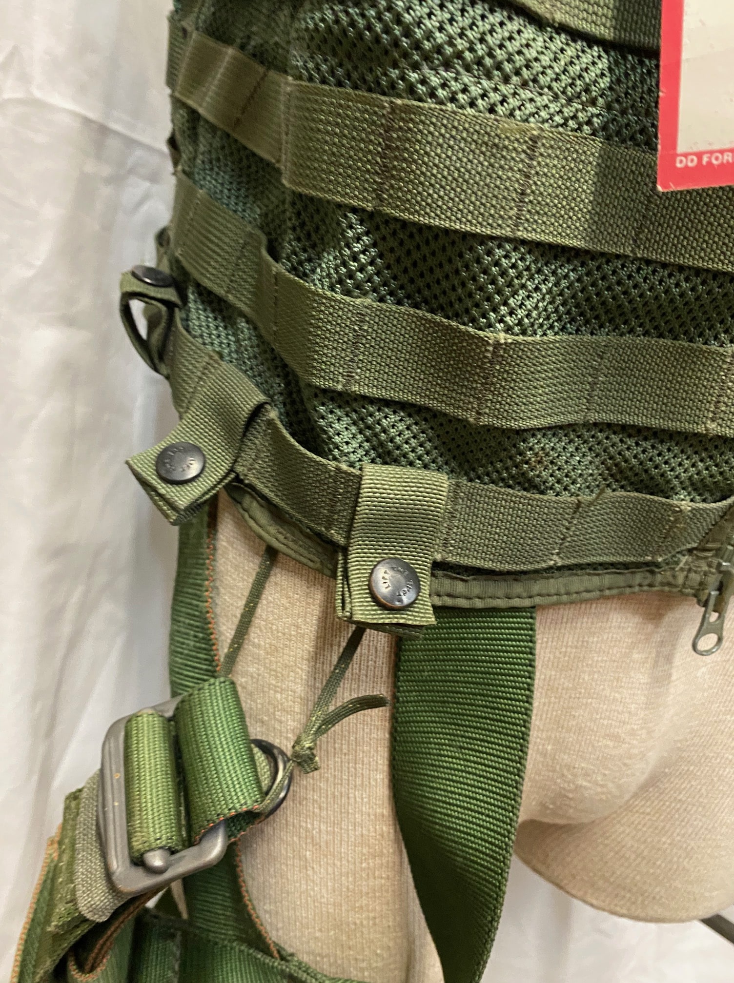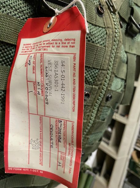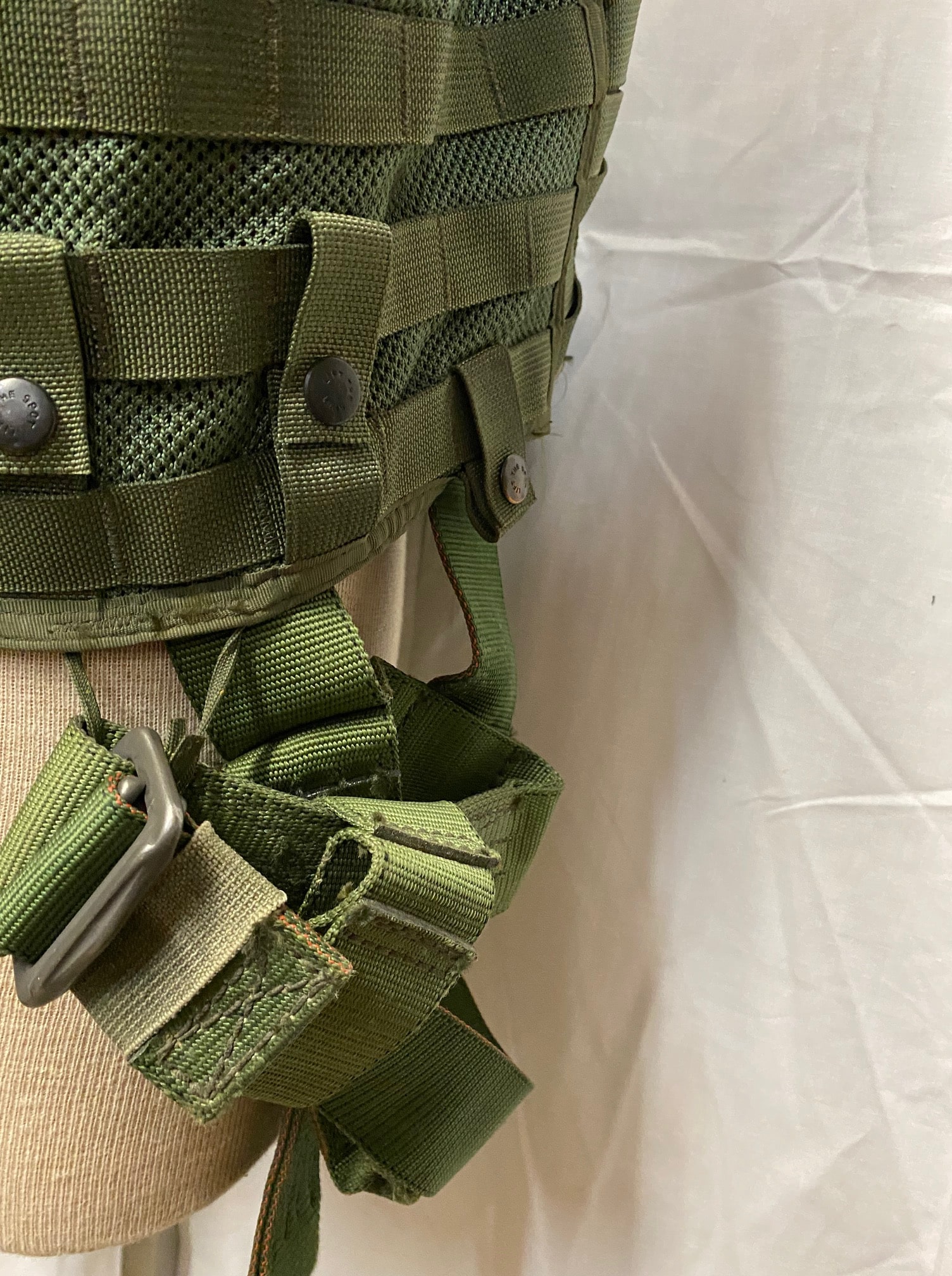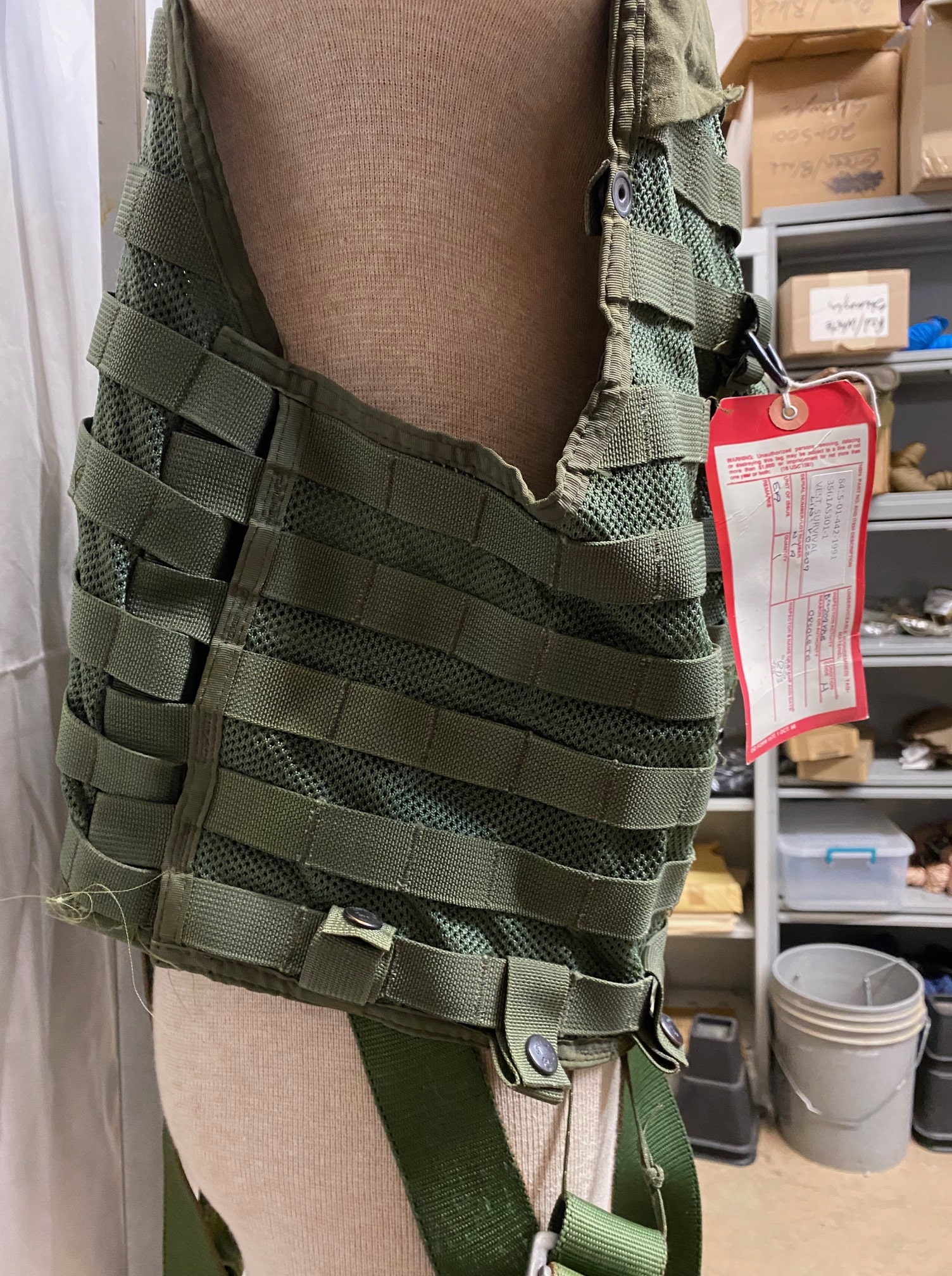 US military spec Olive Drab codura nylon survival vest. MESH style, with suspension straps. Used condition, serviceable. Standard issue for U.S. Navy and Marine helicopter non-ejector aircraft aicrews.