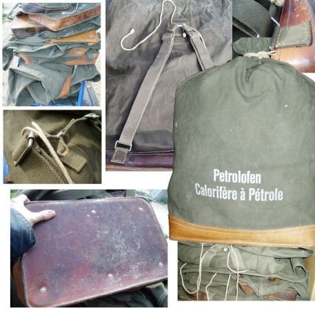 Heavy canvas with leather bottom. This large canvas duffle bag was used to carry kerosene heaters for the Swiss military. Used but in good condition. Inside is metal bottom tray-lined to hold spill over from heaters. They are very clean inside.