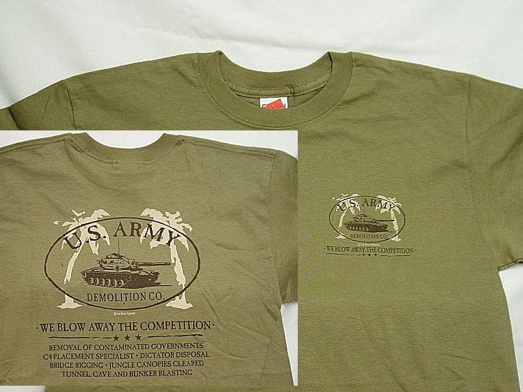 army demolition Khaki brown t-shirt with with small chest logo on front and large logo on back. Army demolition co. T-shirt.