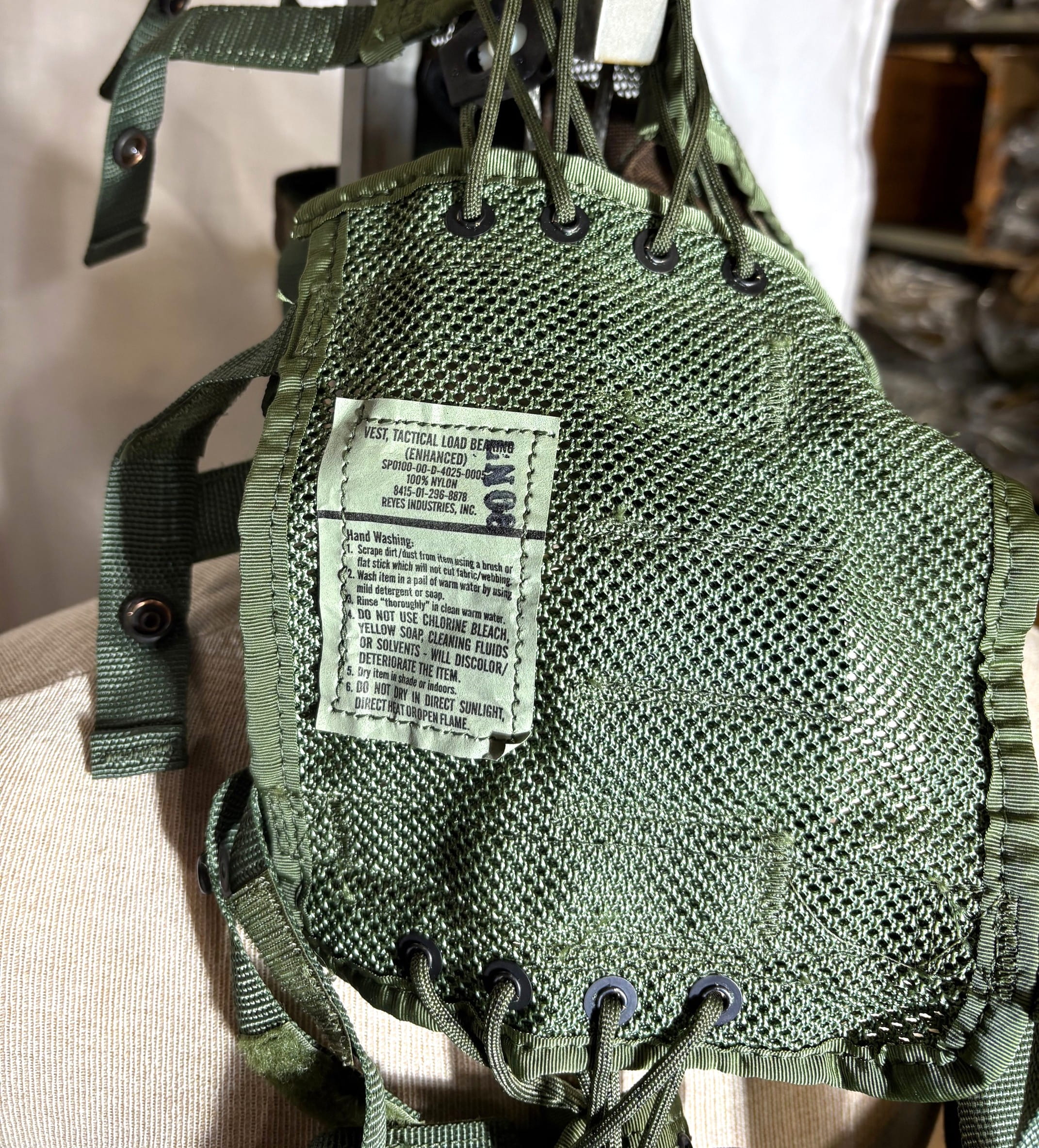 2000 dated tactical load bearing vest, 100 % nylon. Made by Reyes Industries, Inc. Mag and grenade pouches, made to accommodate the equipment belt.
