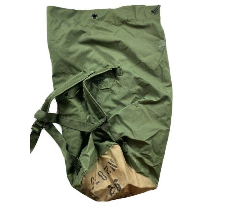 US military duffle bag or sea bag as the navy calls it . This workhorse has been the military standard for over 50 years. If you already have one, you probably need another. They are made of heavy duty, water-resistant, codura nylon. Can be carried with side handle or worn on back with the adjustable padded pack straps. Small outer pouch to carry tickets, passport, etc. 16” dia. x 34” long overall. Olive Drab in color. Used, good condition. All of these were issued, stamped with the soldier’s name (which we blackout), unit and mission marks. Show slight wear and tear. But all parts and pieces are intact and functioning properly. Lots of shelf wear. Original surplus.