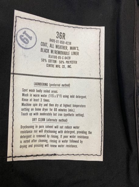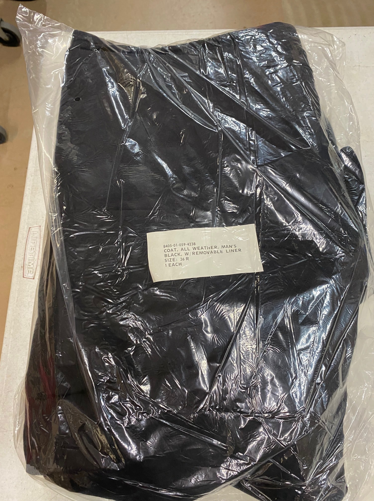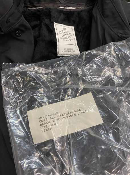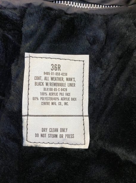 U.S. Army issue top coat trench coat. Color Black. Old style from the 1980’s. No belt, single breasted with zip in fleece liner. New old stock in original packaging. Genuine Issue. Size 36 Regular. and 38-XLong
