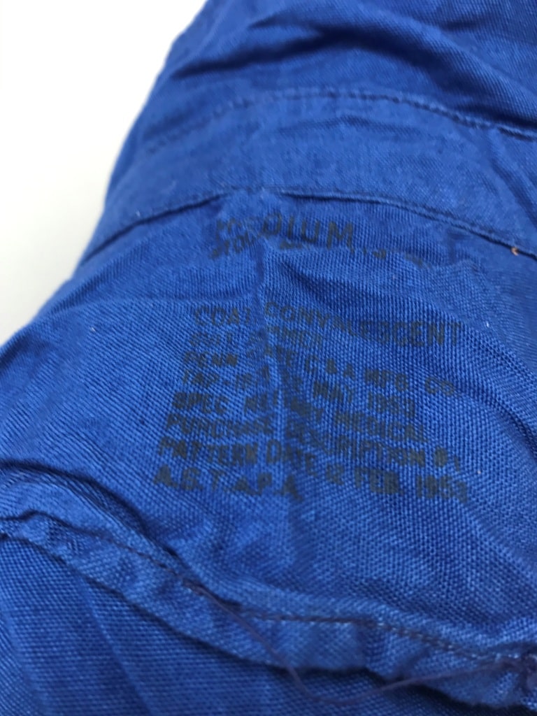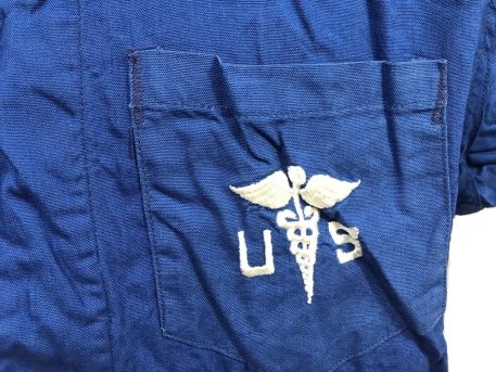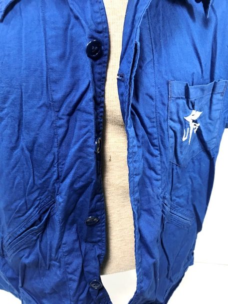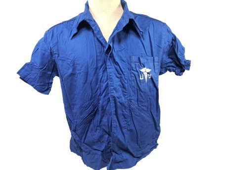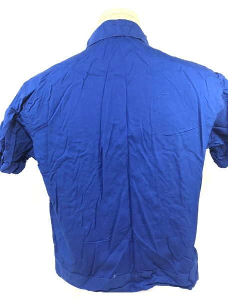 This shirt makes a great pajama or lounge shirt. It is Korean war dated (1953) and a true vintage piece. Short sleeve with 1 breast pocket, 2 hand pockets and a snap waist. Size medium only (fits 38″ to 40″ chest).