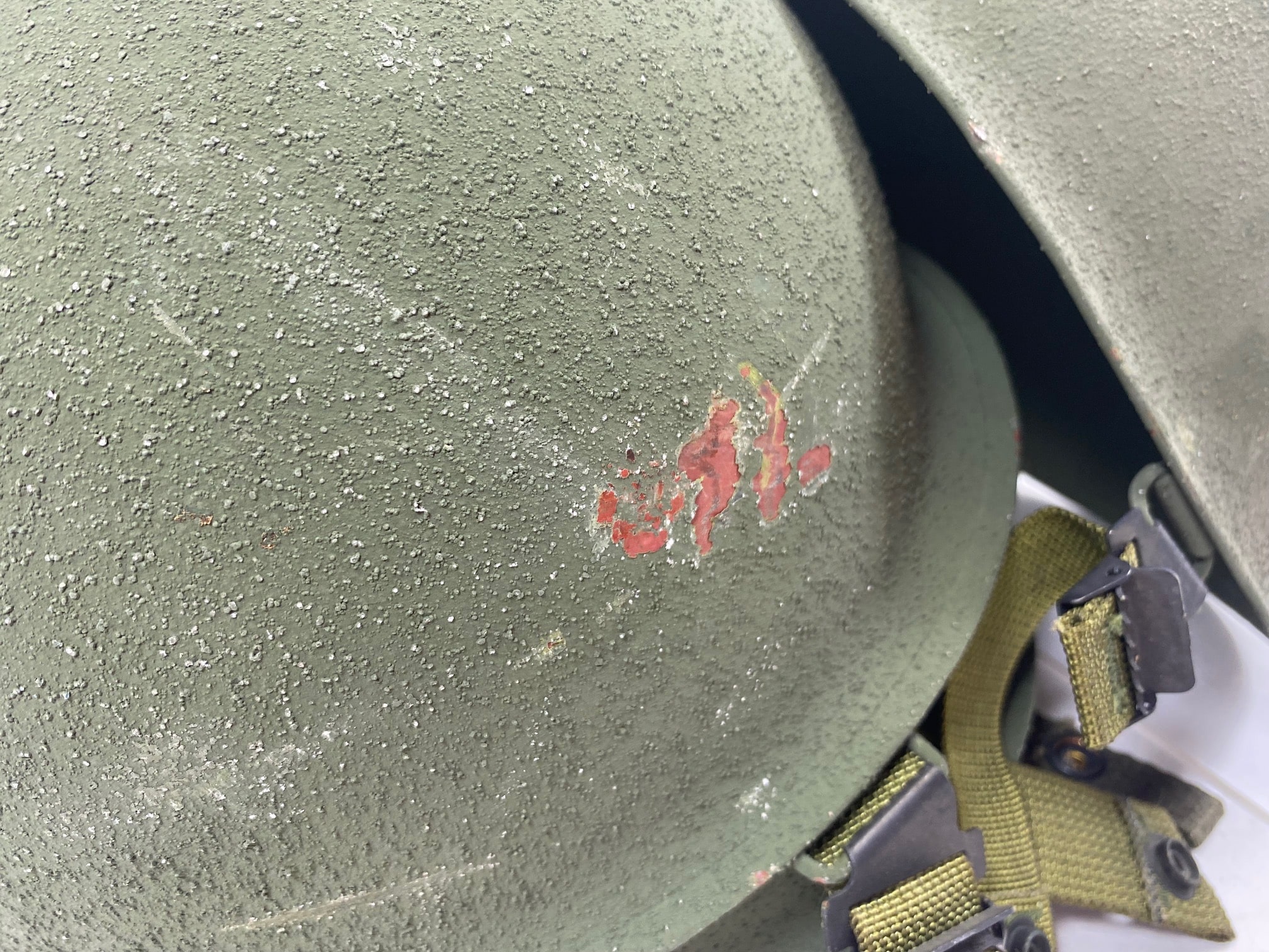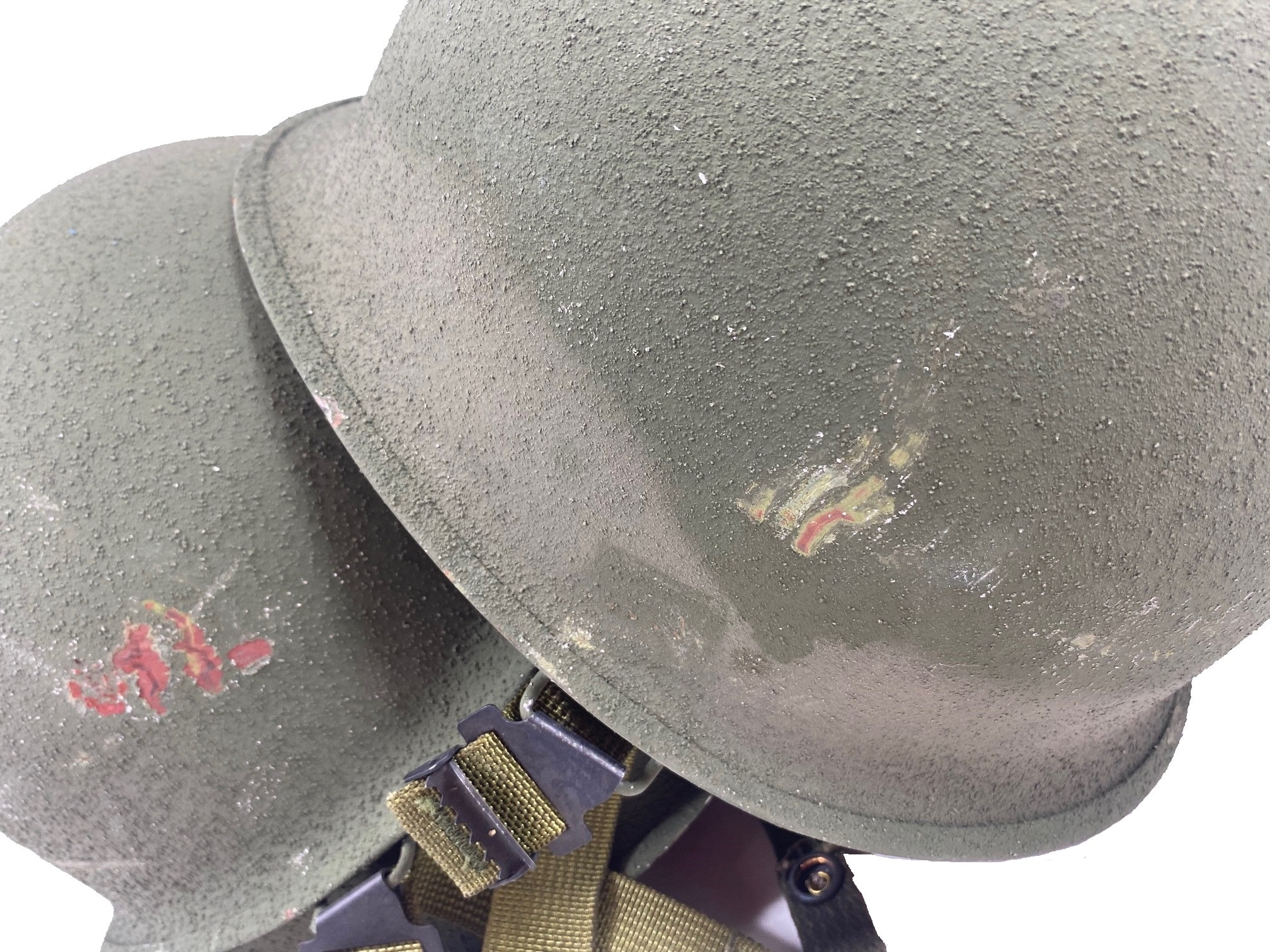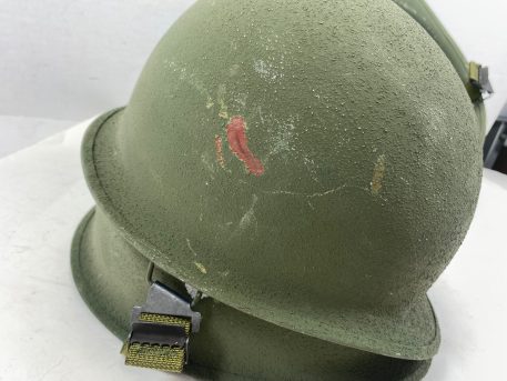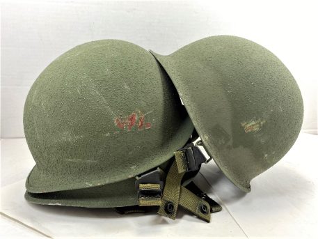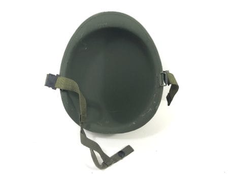 Original U.S. Military issue M1 steel pot outer shell army helmet from the 70’s and 80’s. They have been stacked on top of each other, and as such, the chinstrap brackets have rubbed -off the paint of the helmet it was stacked on top of. Nice color with a rough-sand finish. Includes new original issue nylon chinstrap.