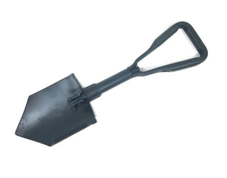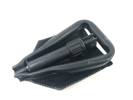 Military issue entrenching E-tool Tri-fold shovel, used and in good condition. Scratches and scrapes.