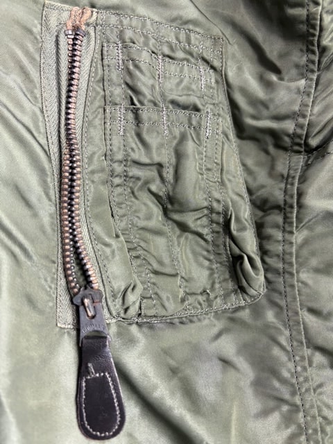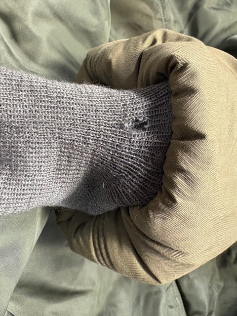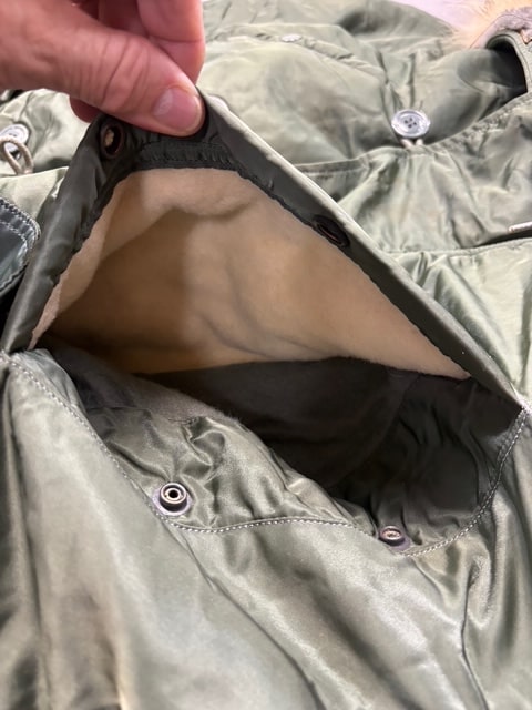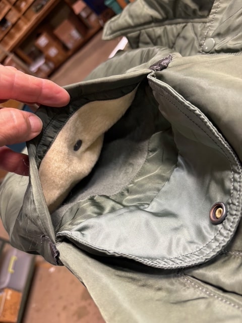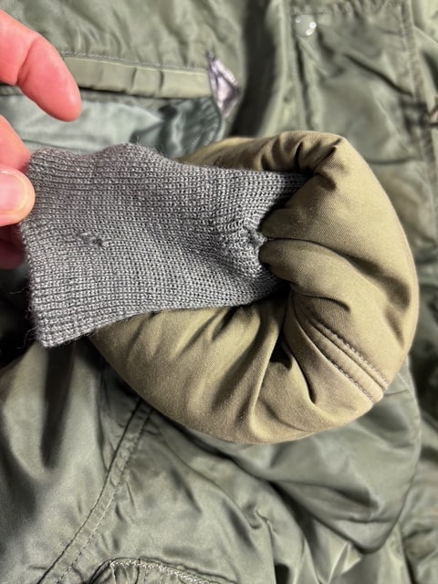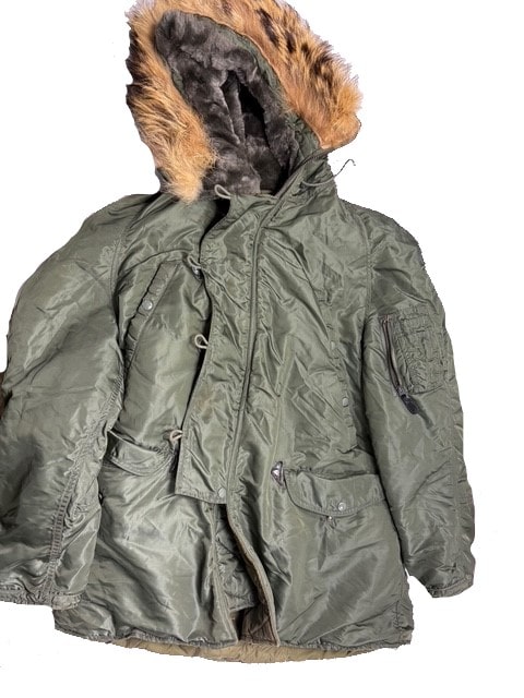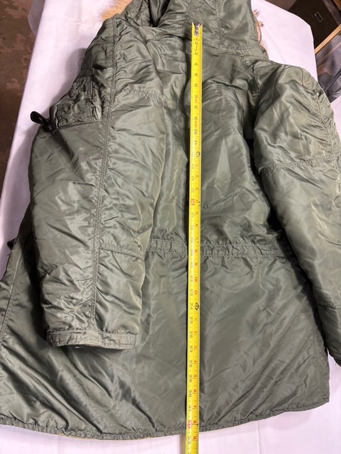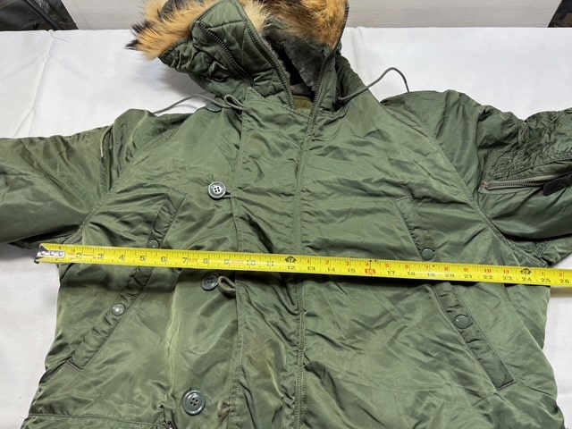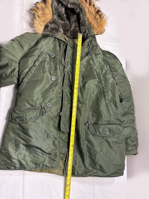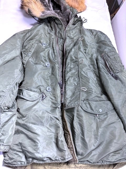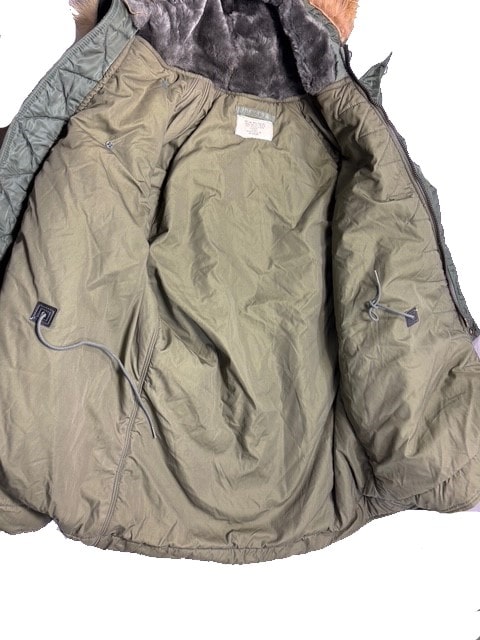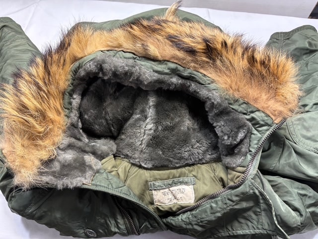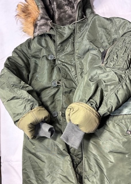 US original 1960’s USAF N-3b Parka. Nylon Twill make. This jacket is new old stock, but from age and storage shelf wear- some deterioration has begun. A stain in the center of the jacket can be seen (see attached photo) and some moth holes on each wool cuff. Otherwise the jacket is very pristine and good. This is a 1 only jacket. Sold as is, no returns.