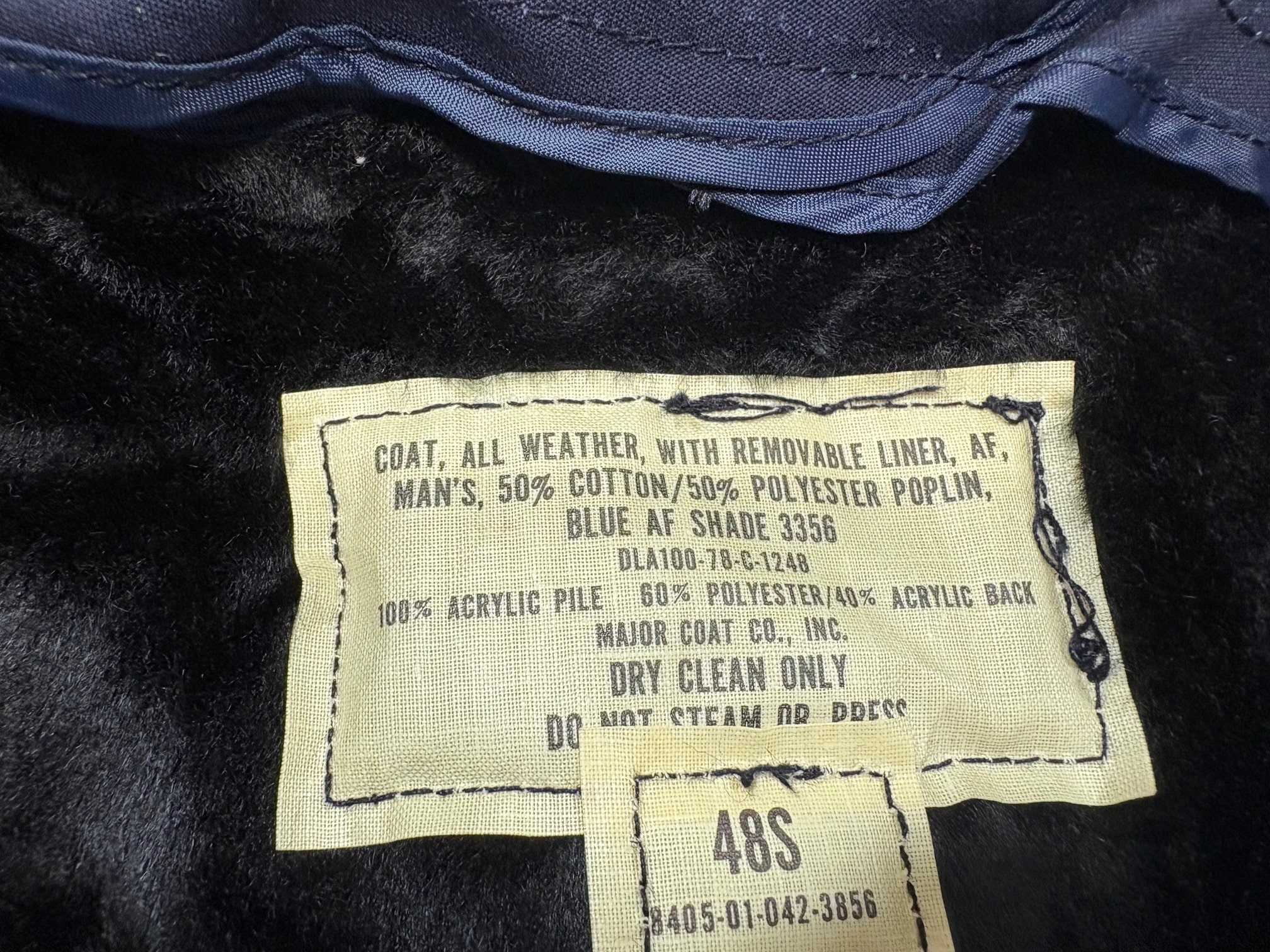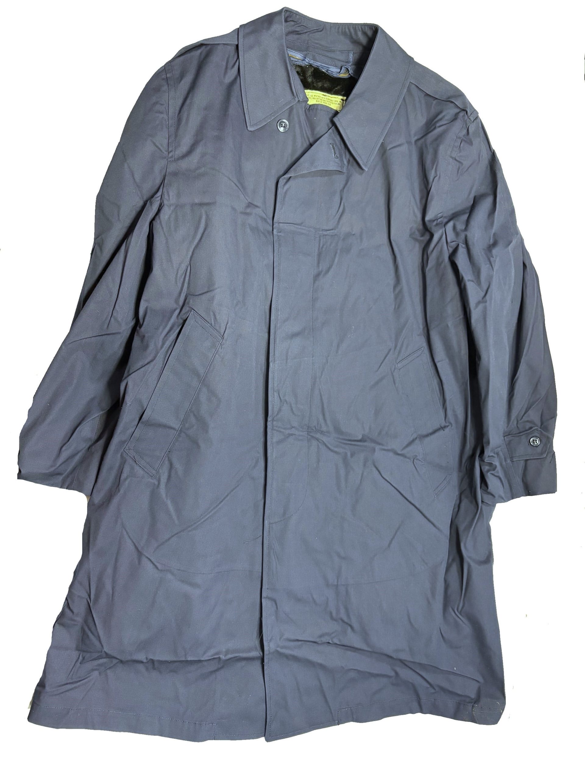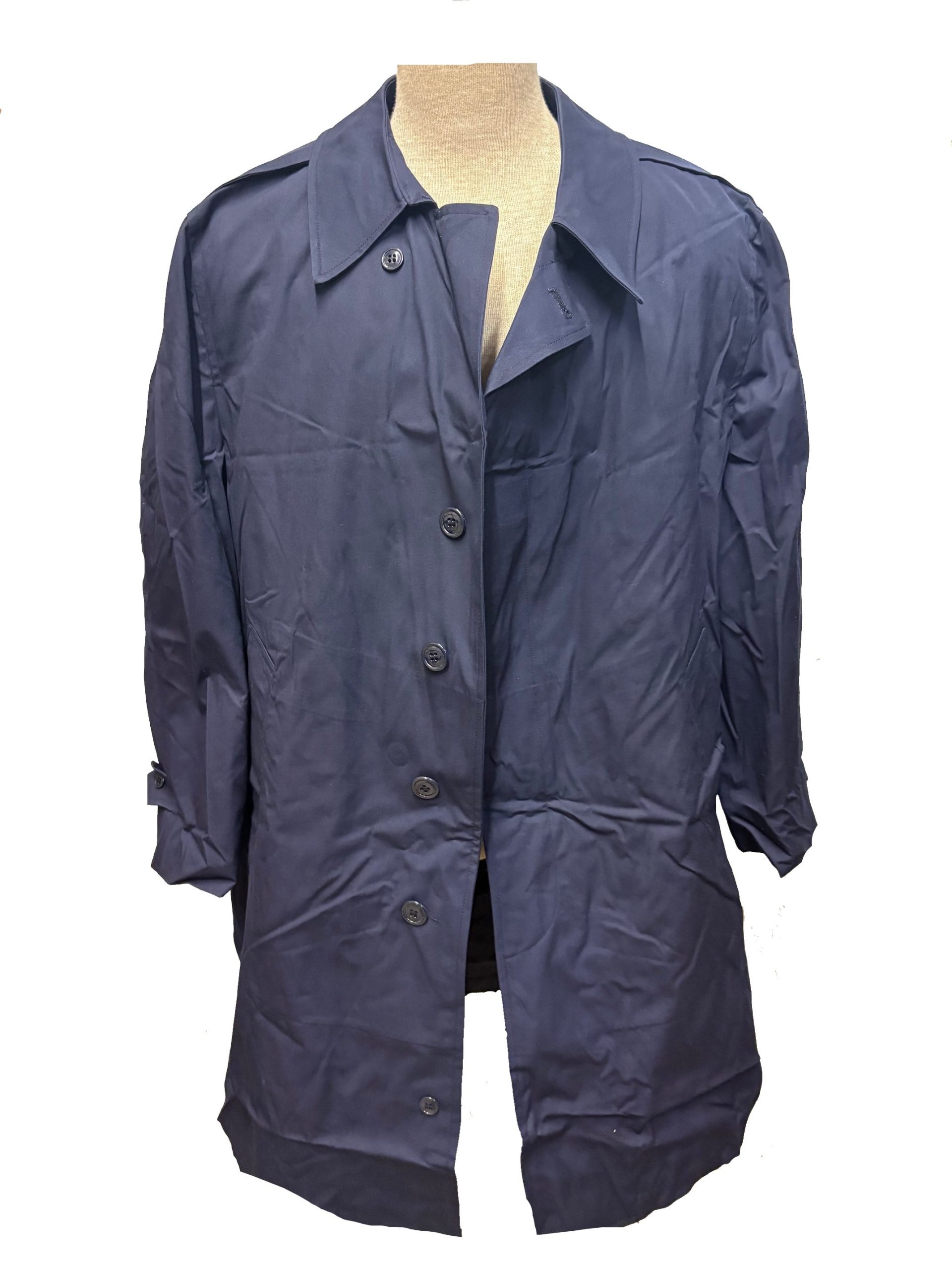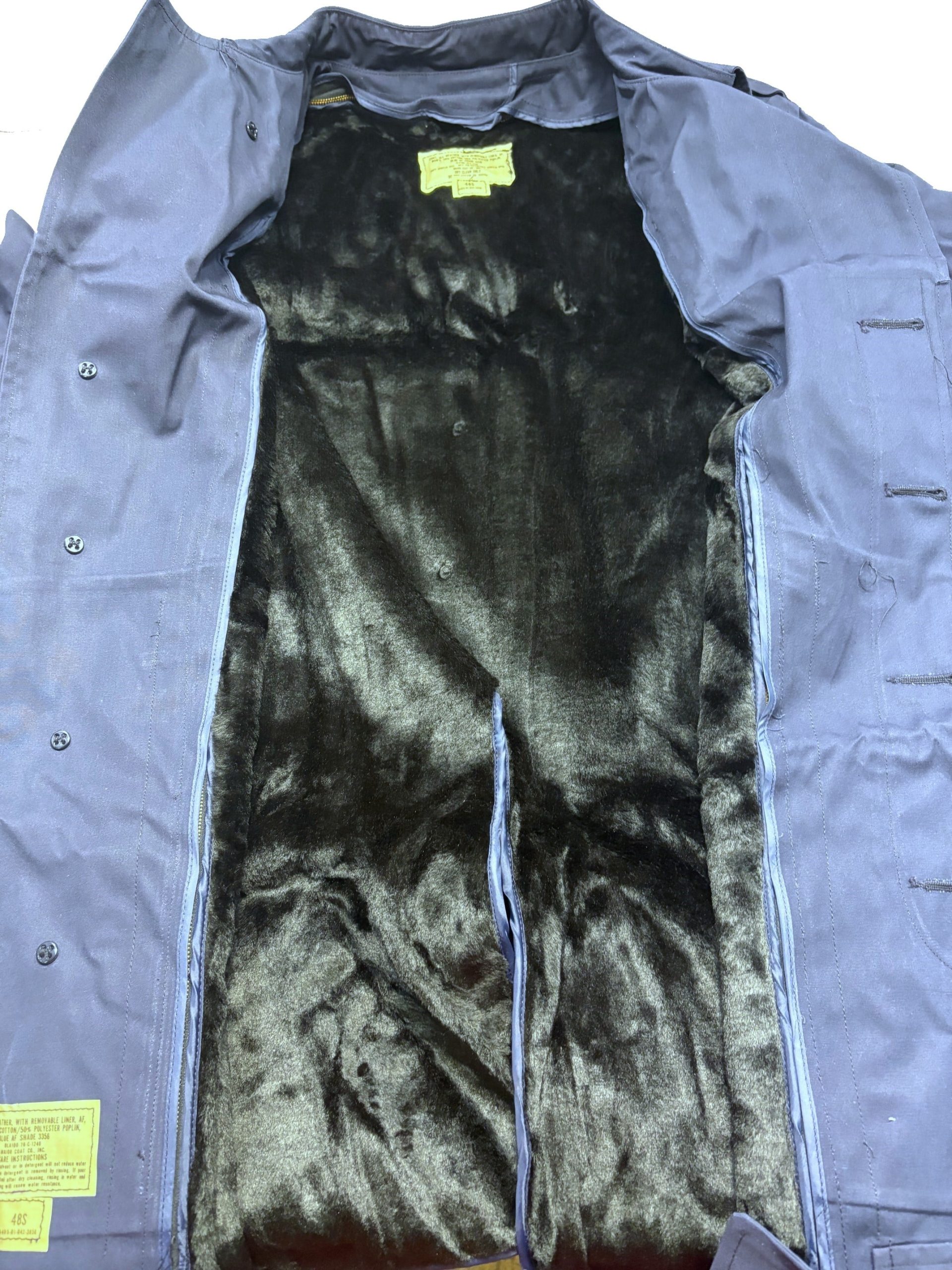 U.S.A.F issue top coat trench coat. Color Blue. Old style from the 1970-80’s. No belt, single breasted with zip in fleece liner. New old stock in original packaging. Genuine Issue. Size 48 SHORT
