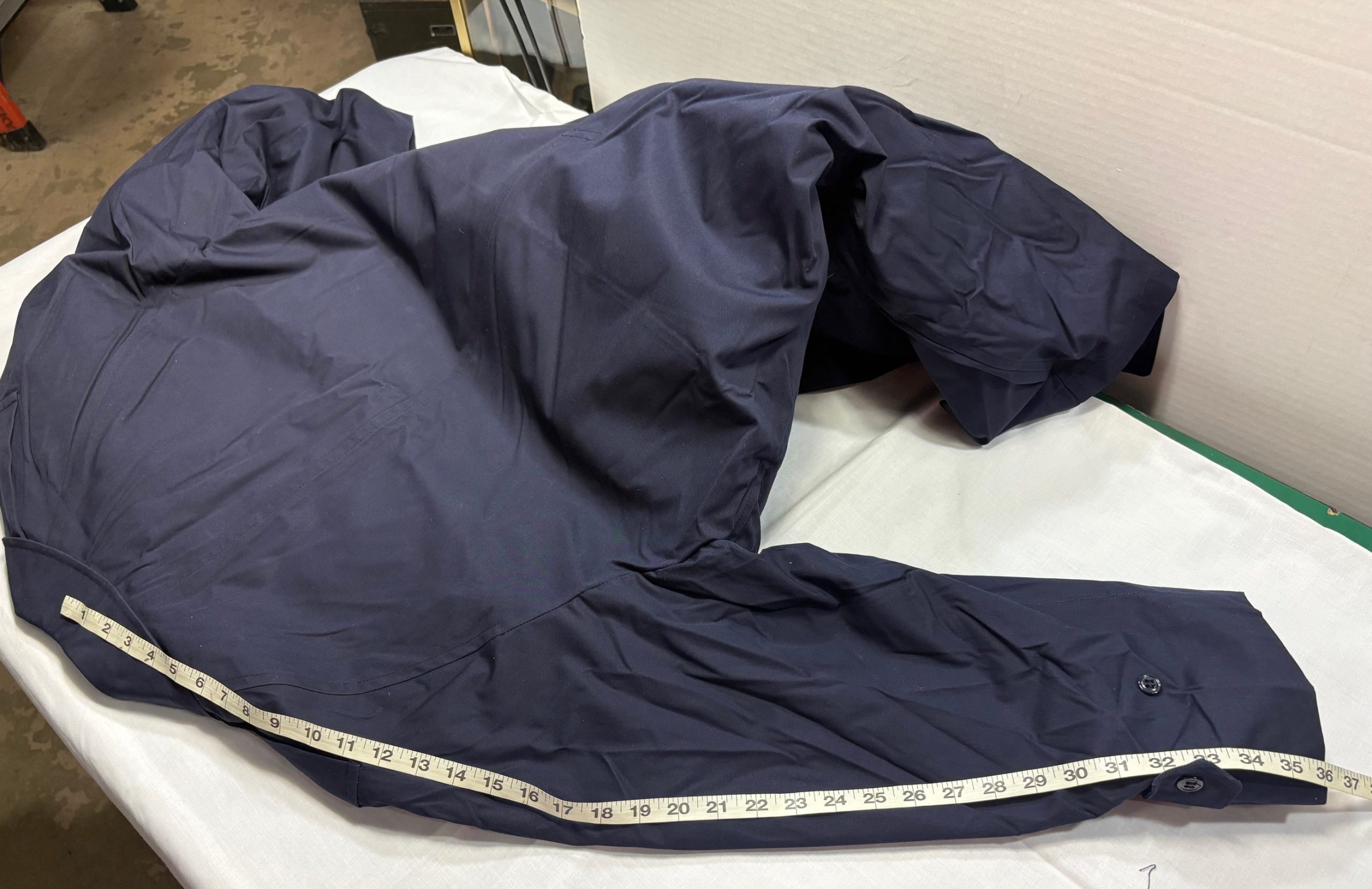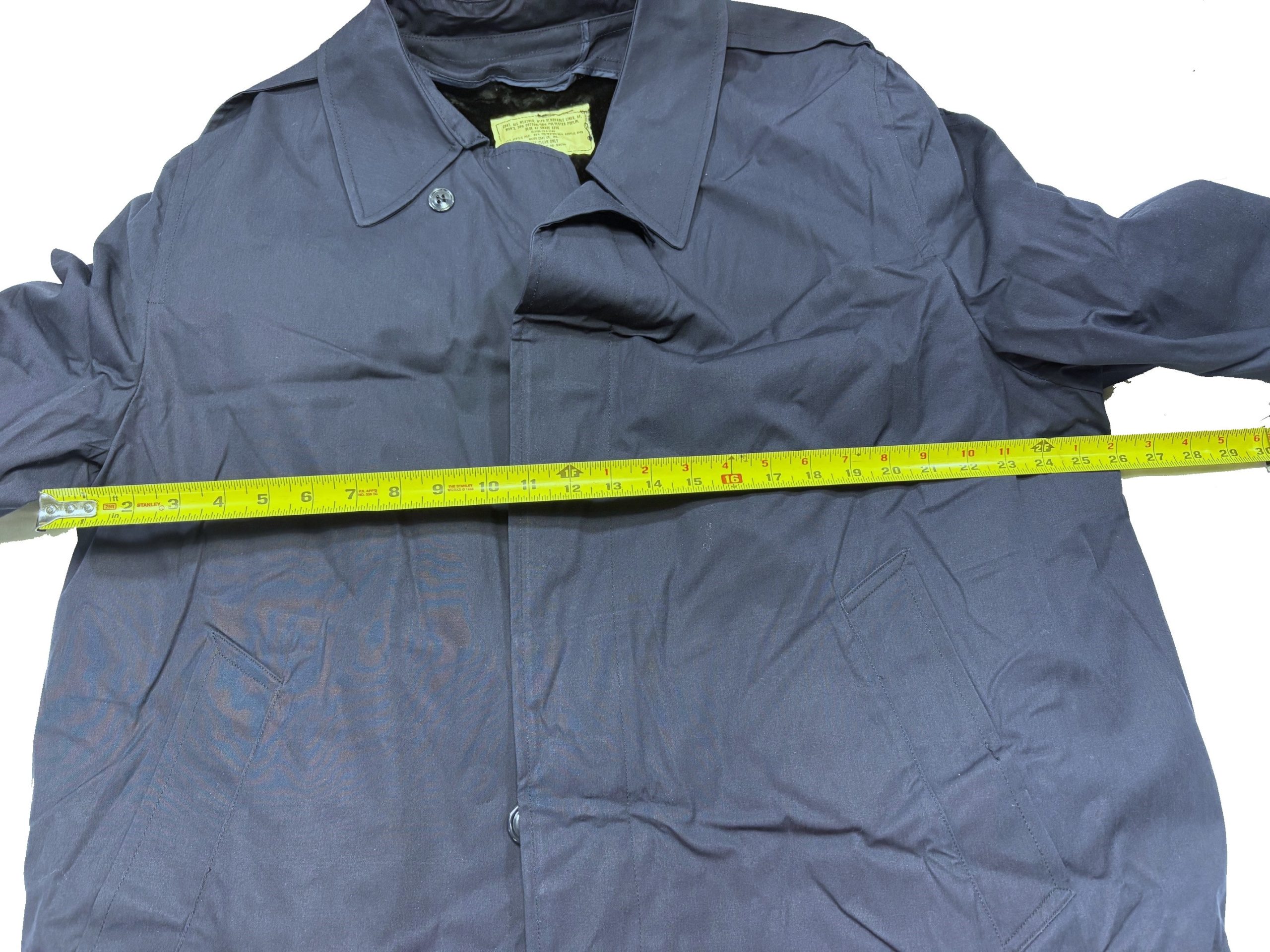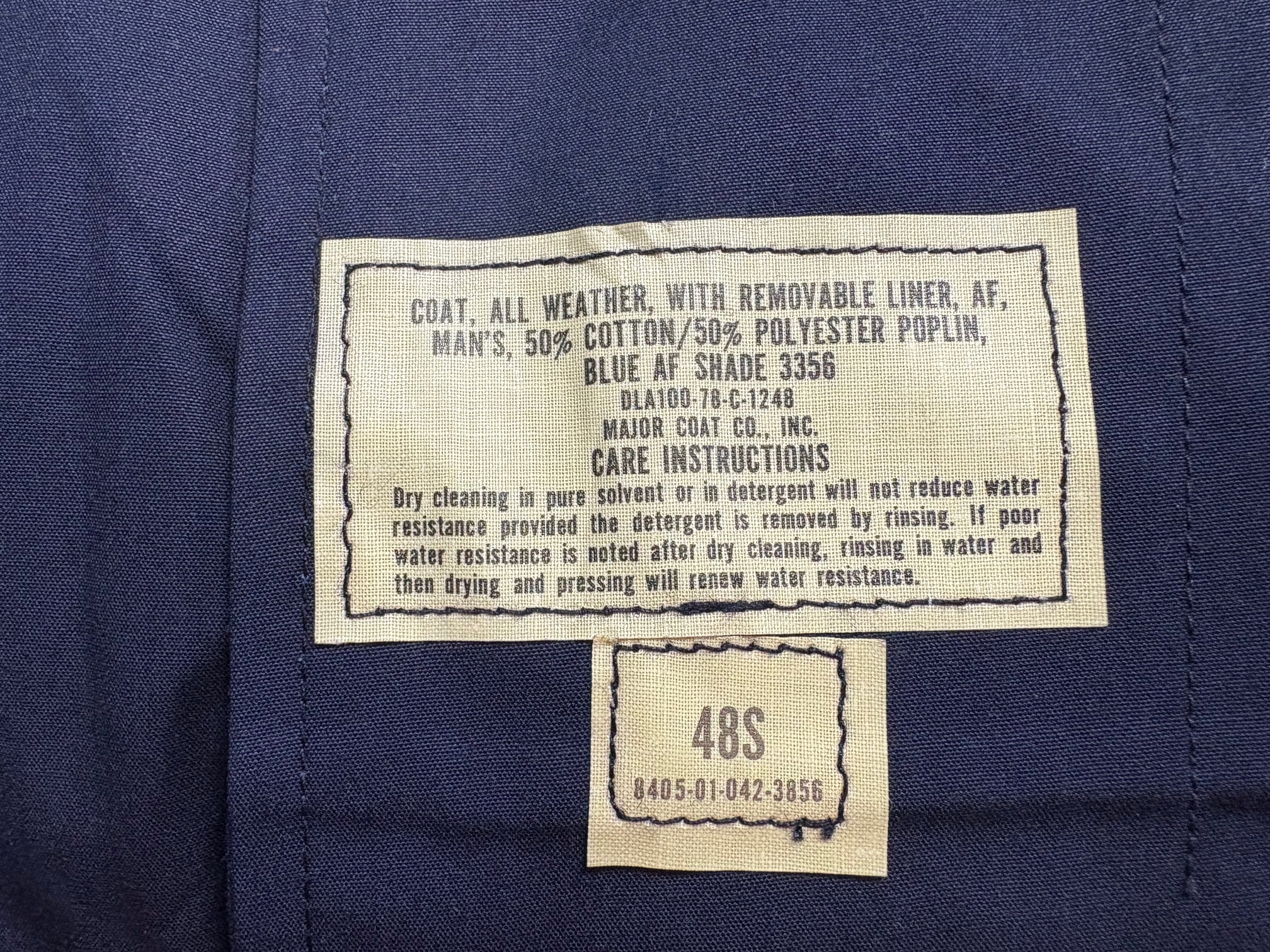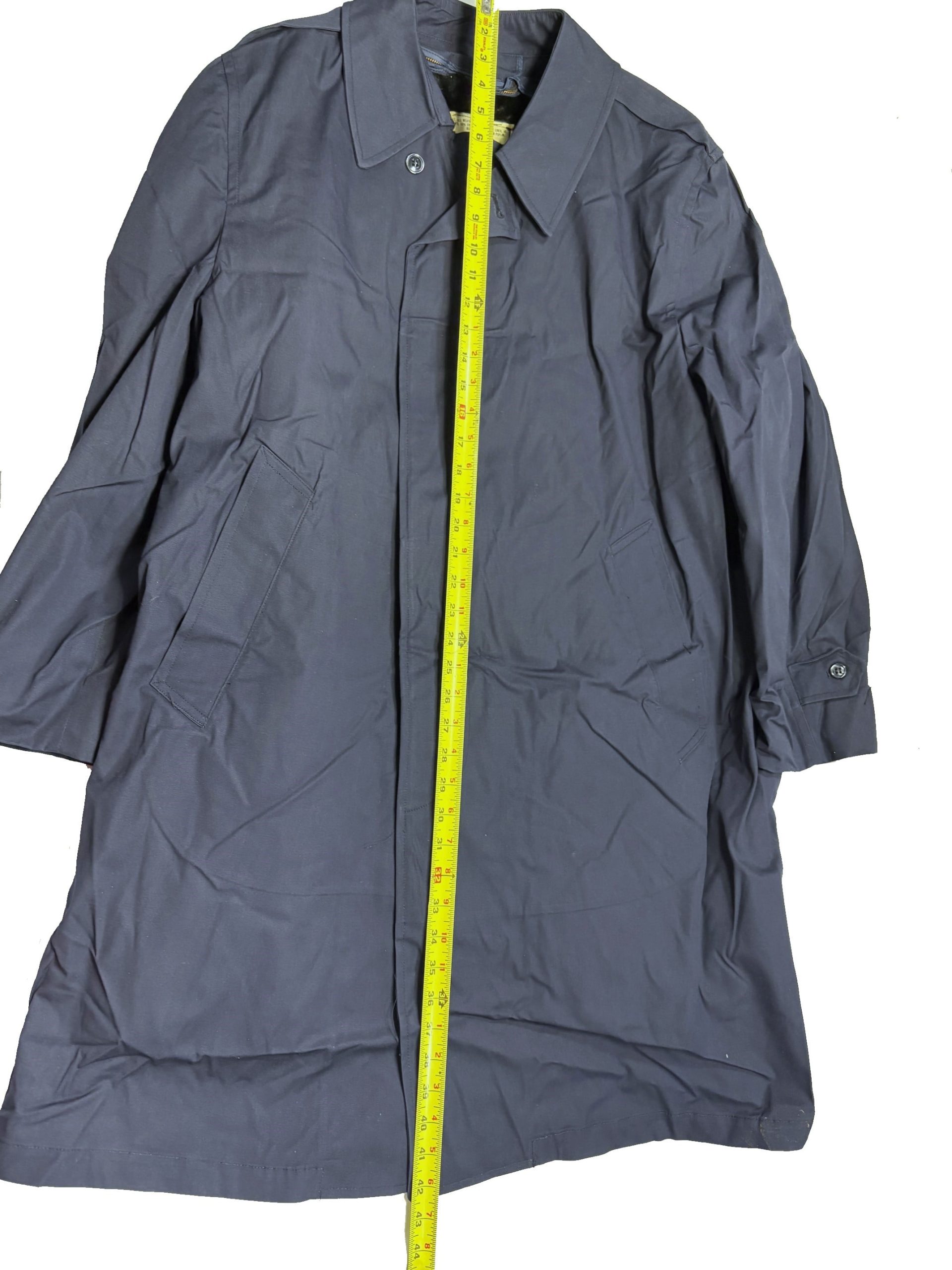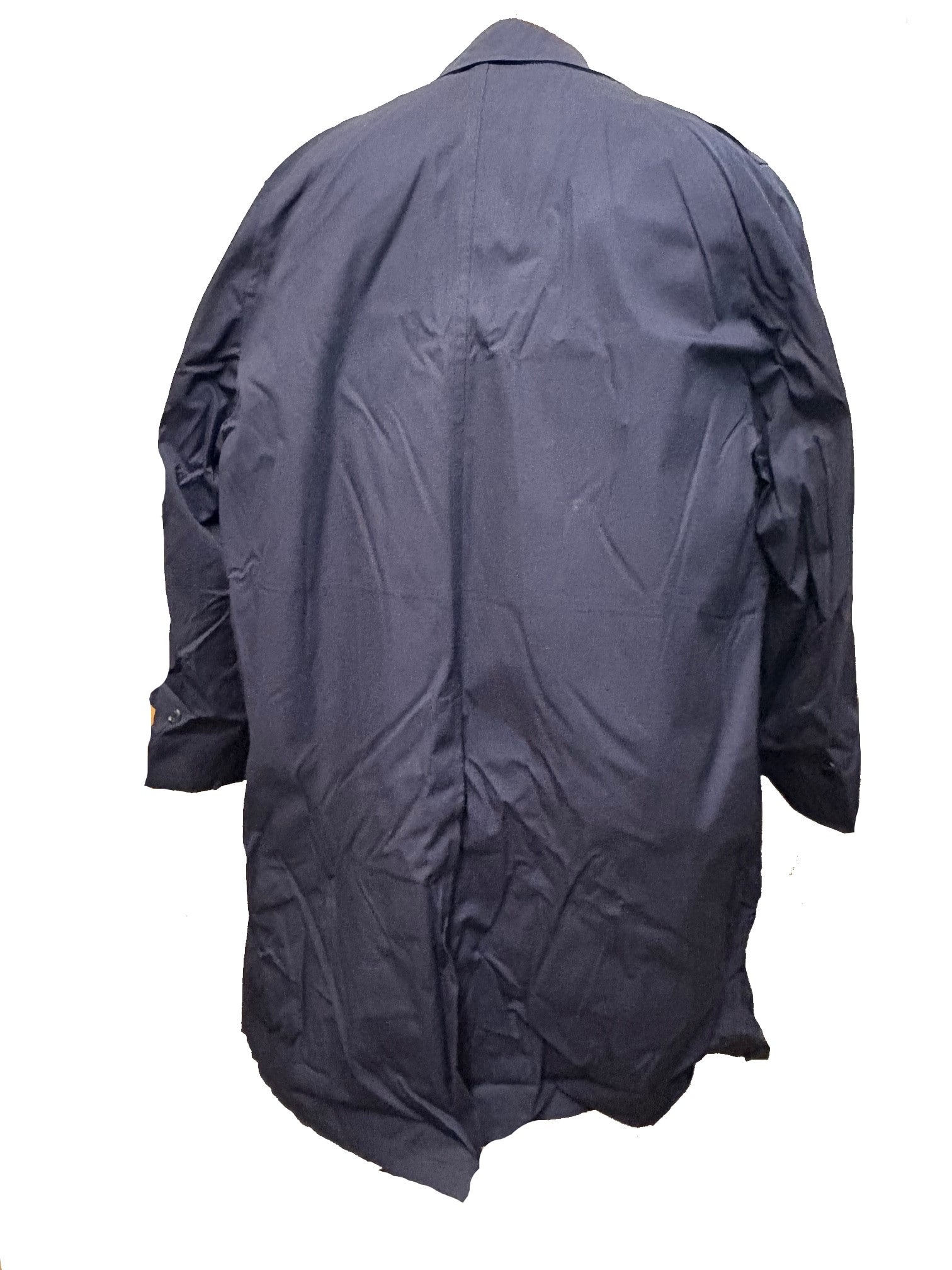 U.S.A.F issue top coat trench coat. Color Blue. Old style from the 1970-80’s. No belt, single breasted with zip in fleece liner. New old stock in original packaging. Genuine Issue. Size 48 SHORT