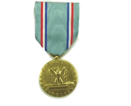 The medal is the same as the Army Good Conduct Medal and was designed by Joseph Kiselewski. On the obverse is an American eagle with wings displayed and inverted, standing on a closed book and a Roman sword. Encircling this are the words “Efficiency, Honor, Fidelity” at the medal’s outer edge. The reverse has a five-pointed star above a blank scroll suitable for engraving the recipient’s name and above the star are the words, “For Good” and below the scroll “Conduct.” Is encircled by a wreath of laurel and oak leaves. New original issue.