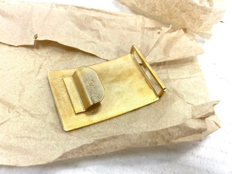 New old stock United States Marine Corps brass buckle for the Dress Blue Uniform. From age and storage, the brass has begun to darken and “turn” from the brown paper it was wrapped in.