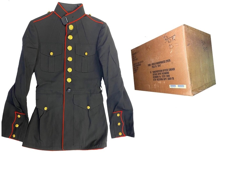 All original United States Marine Corps dress tunics. New old stock. FULL BOX, 15 DRESS COATS PER BOX. Great low price!