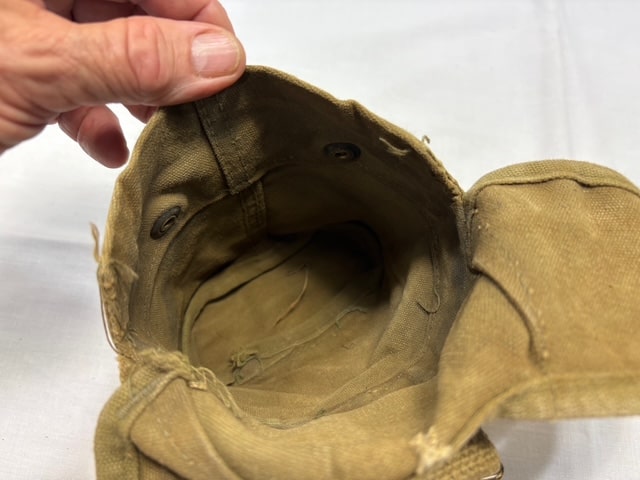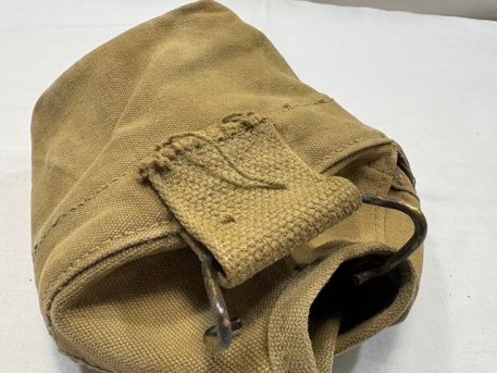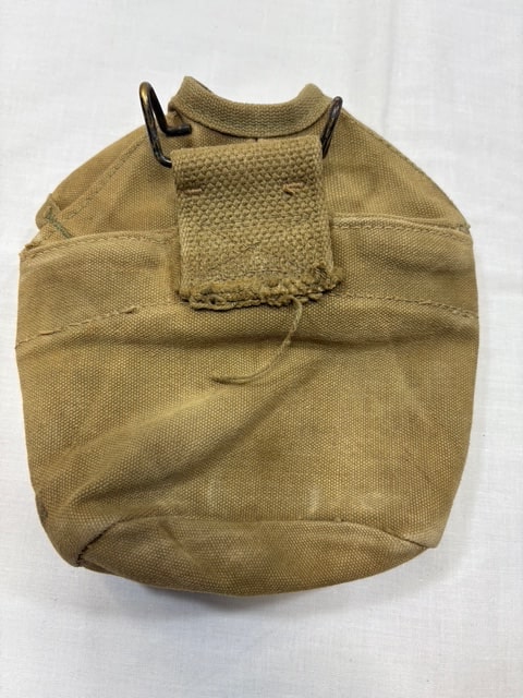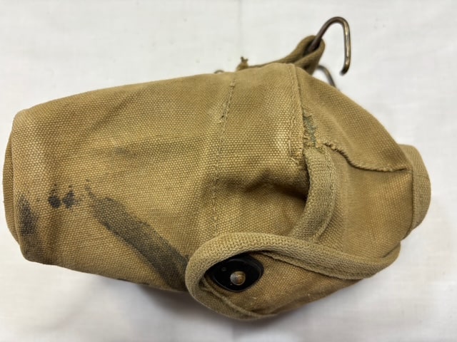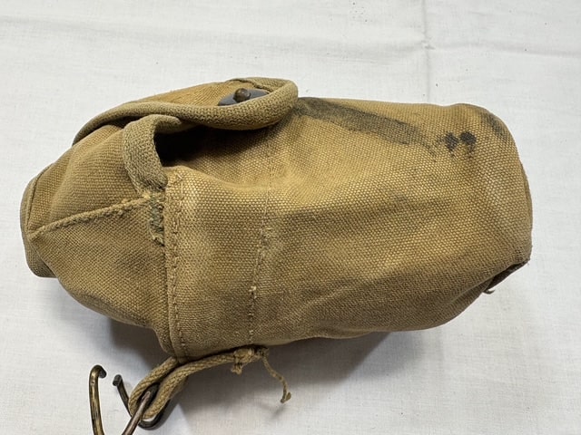 Used condition. Slight tear on the stitching at the bottom of the canteen cover from age. Wire hooks are made of Steel. Some surface rust on the tip of the hooks. Snaps are brass, slight oxidation.