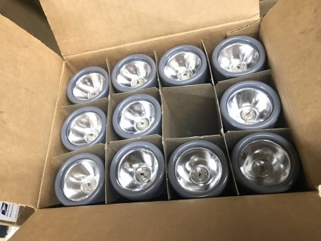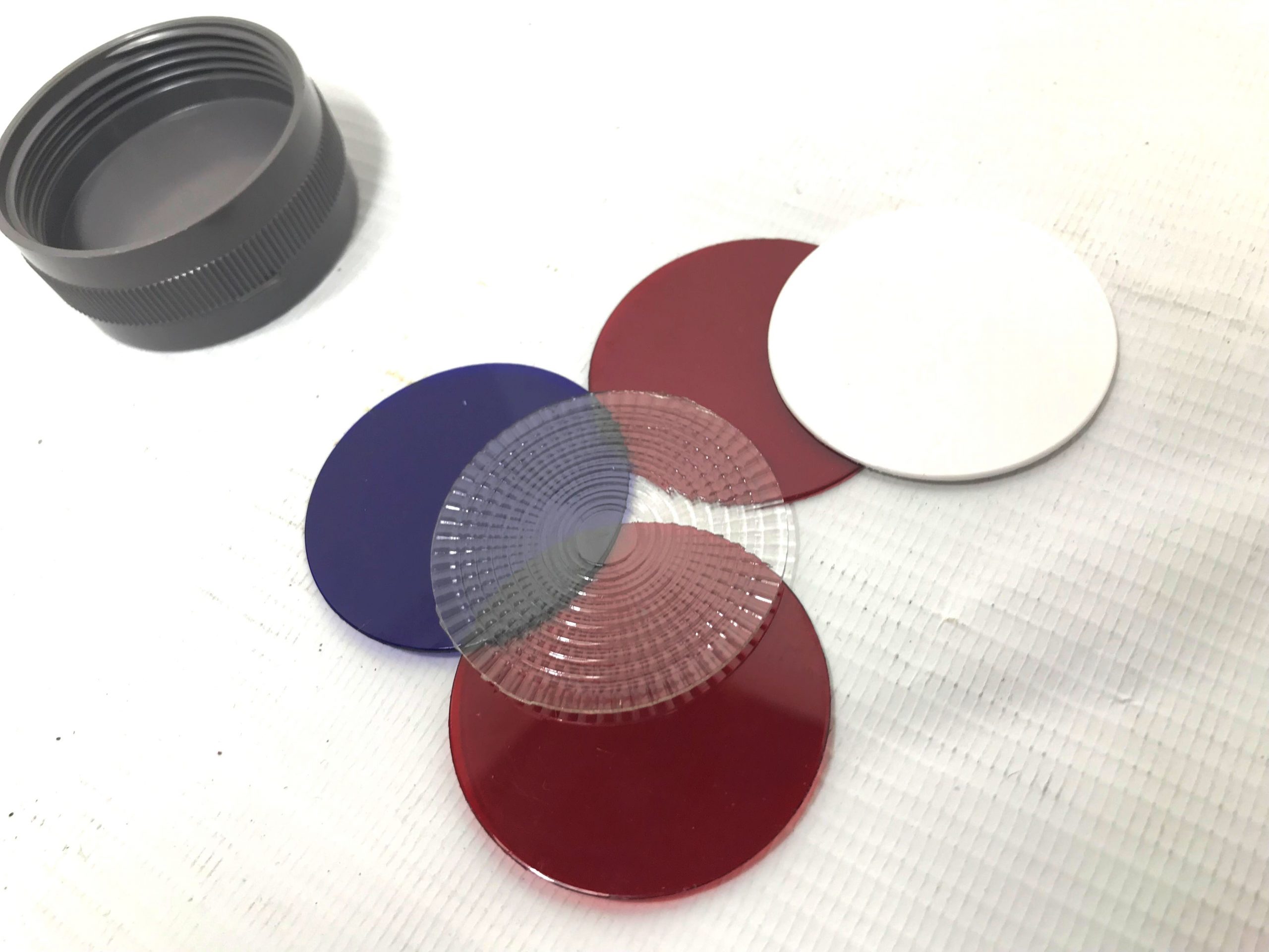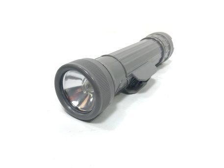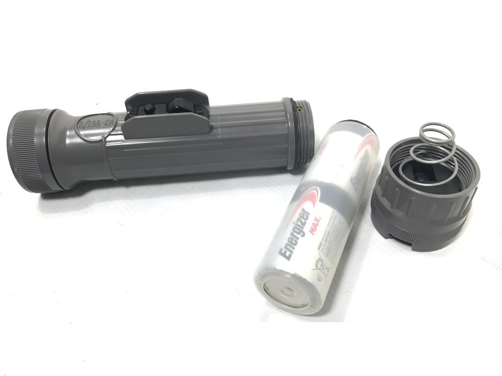New U.S. Made by Futlon. Sturdy and dependable, this flashlight is water resistant and comes with spare bulb and red, blue, lenses. Grey in color. Genuine flashlight comes with a d ring hook up and has a three position on-off and flasher switch. Holds two D-cell batteries (not included). Extra lenses and spare bulb included. Protective sleeve for batteries.