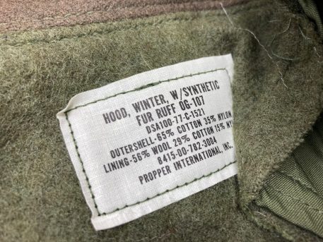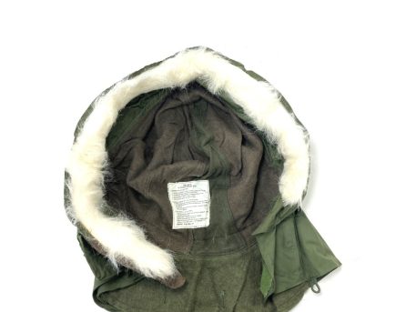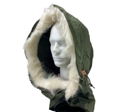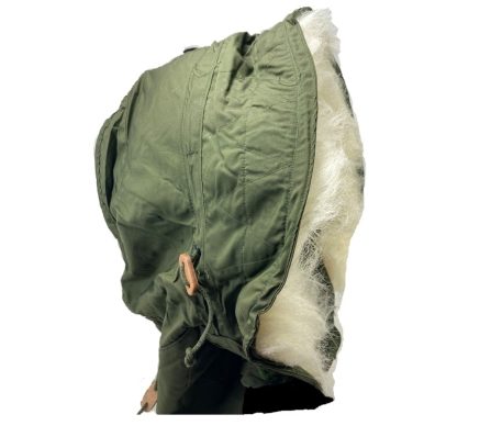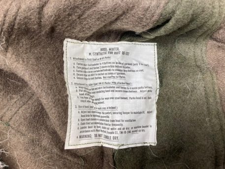 USN Shore hood. Original issue. Synthetic fur lined. water impermeable codura nylon parka style hood. Can be worn in combination with any jacket because it features under the arm straps that allow it to be worn directly attached to the body. Functions very much like the Army extreme cold weather parka hood. smaller size say medium