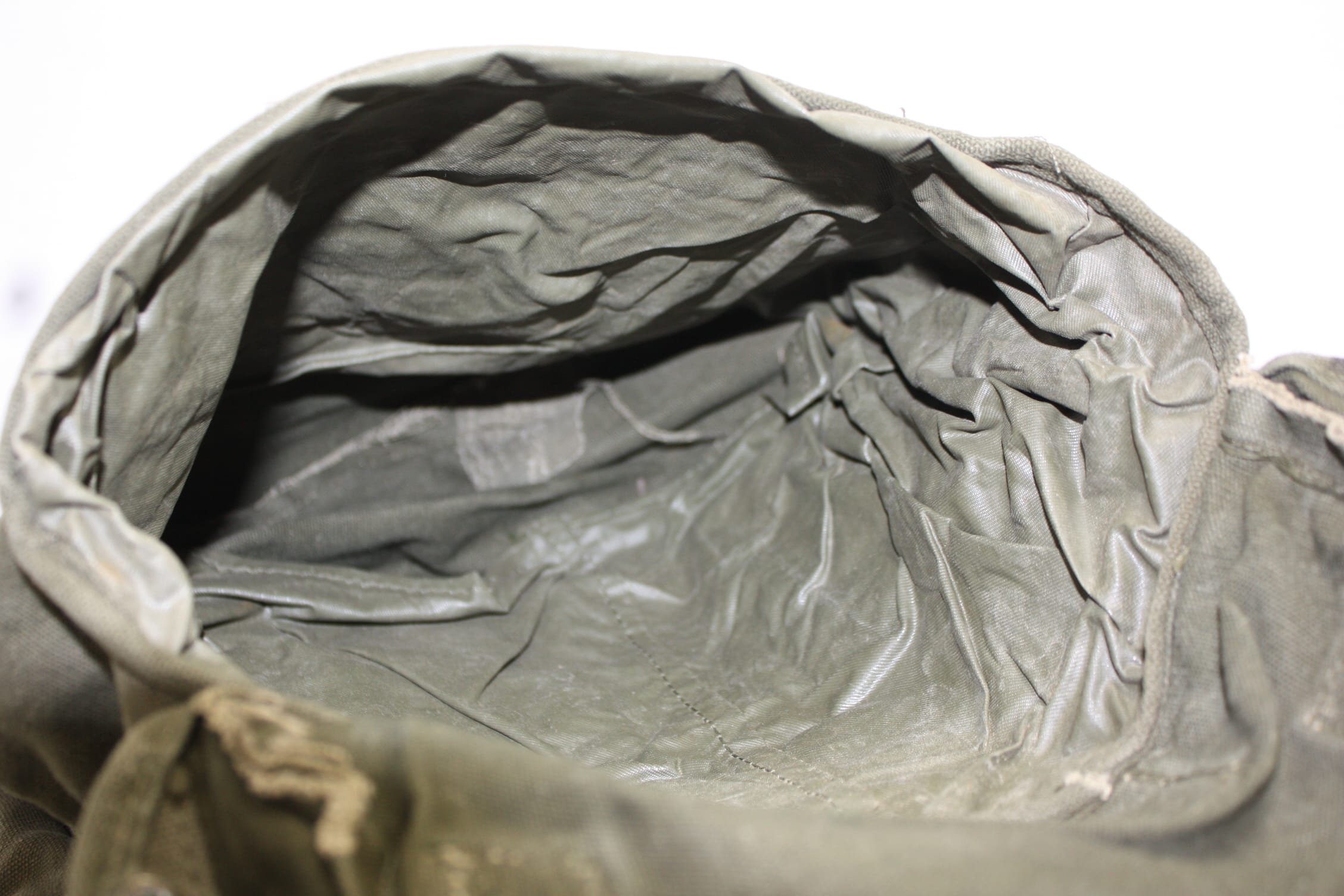 The Vietnam m-61 buttpack is similar to its predecessor the m-56 except a rubber throat was attached to help waterproof the contents. The vietnam issue butt pack is typically attached to the cotton pistol belt, and the suspenders hook into the eyelets on the top of the pack. The pack can also be worn above the belt on the field pack adapter strap, which carries the entire weight of the pack on the suspenders up high on the back like a small backpack. This cotton canvas pack is in good condition and perfect for reenactors as well as general camping and survival use. The design and construction make this a durable and rugged pack for even present day use
