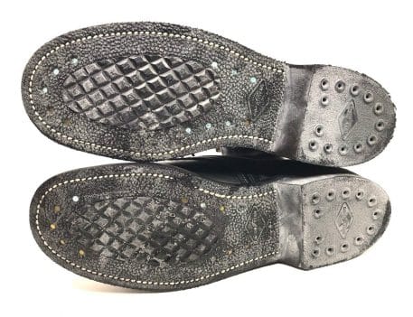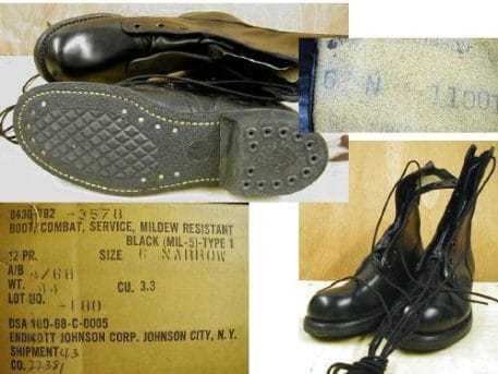 New, old stock. Flat heavy safety sole (almost like jump boots) as opposed to the later issue traction gripping Chevron sole. All size 6N only. 1967 dated.