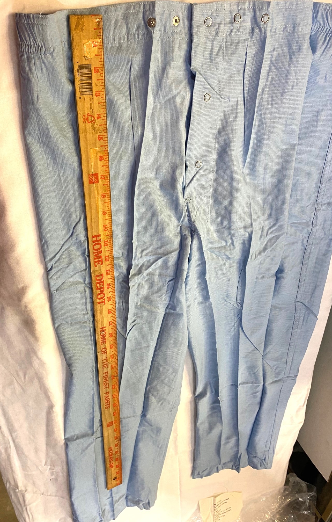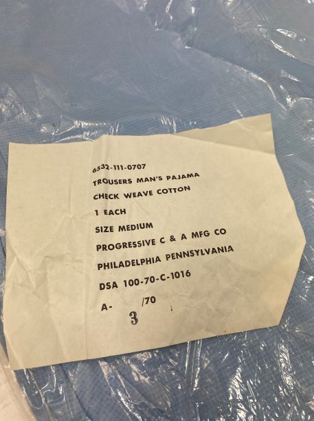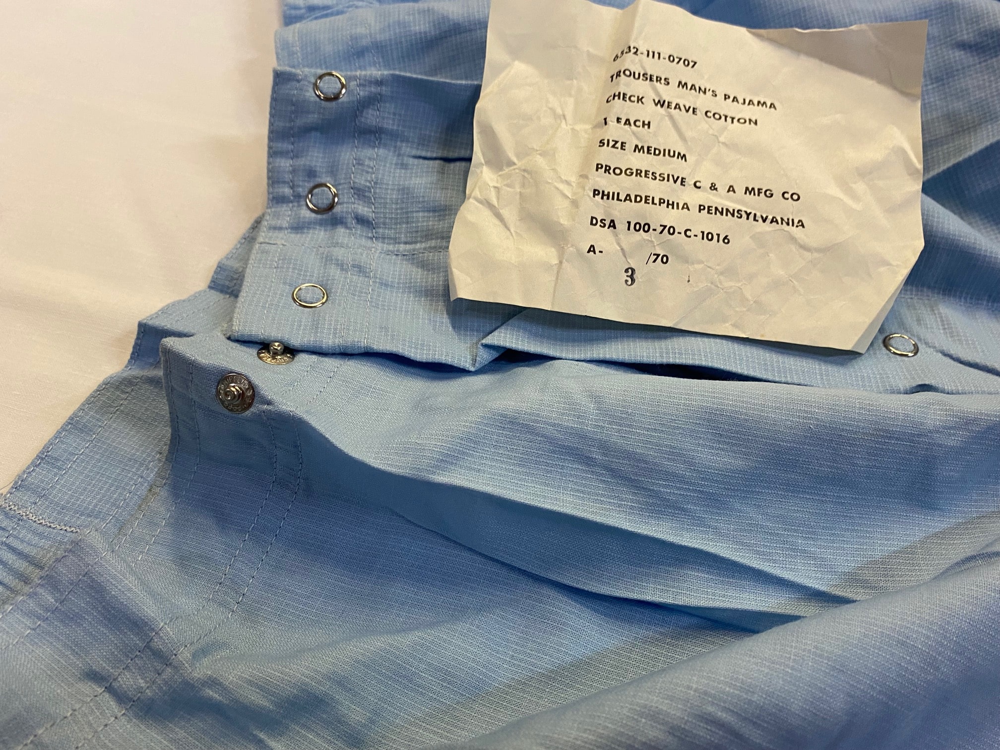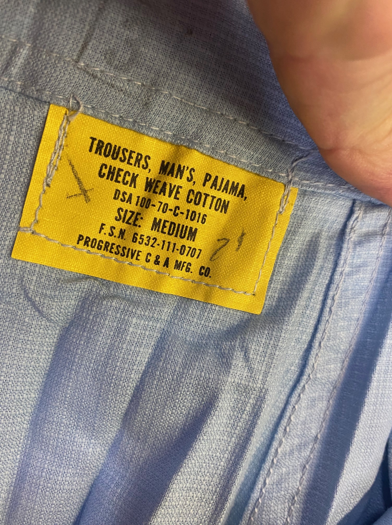 Vietnam era dated cotton check weave pajama trousers. Lightweight, roomy and comfortable. Distributed to patients in hospitals. They provided the wounded and recovering fighting personnel comfortable loose clothing to properly heal. New old stock with adjustable waist. SIZE MEDIUM ONLY.
