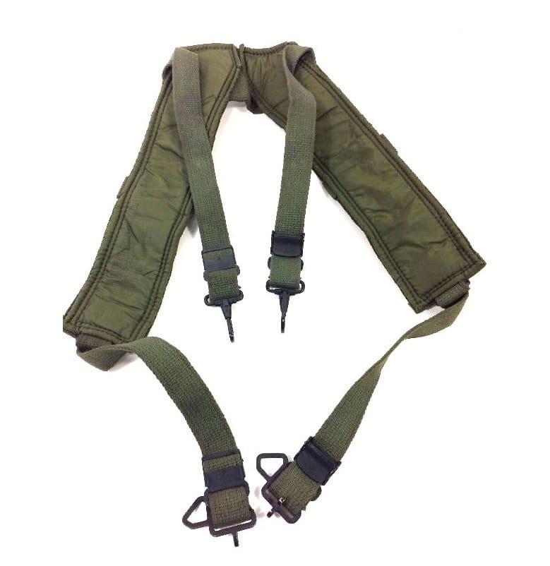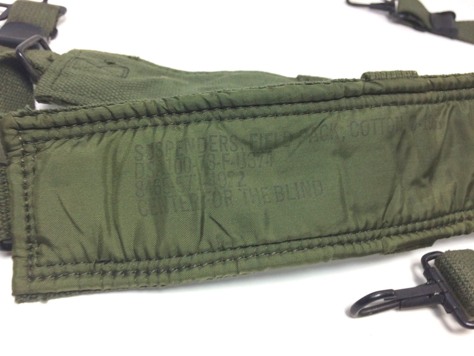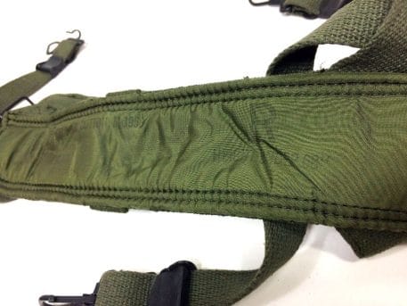 Early Vietnam combat load harness, used to support the equipment belt. This version has the Canvas outer and Nylon inner. Designed to be worn above the lower pockets on the BDU shirt. Will fit up to 5′ 8″ person. 1973 dated. NEW OLD STOCK