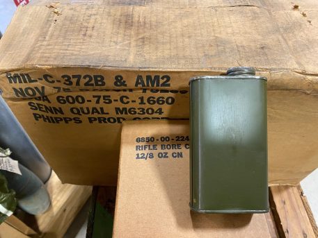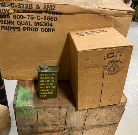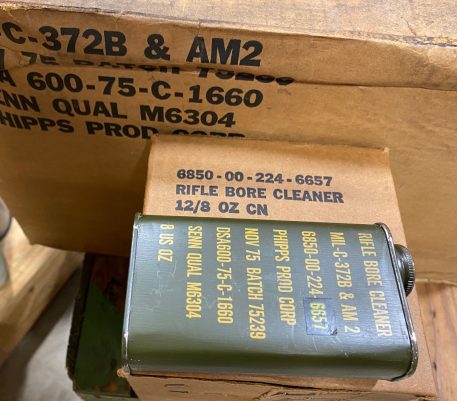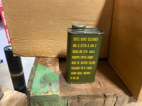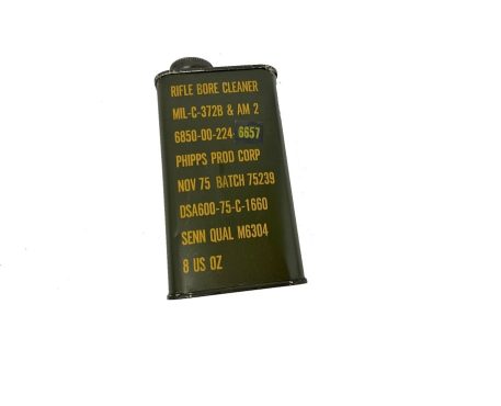Military issue. This bore cleaner comes in 8 oz. cans, so there is plenty to clean many rifle bores. The cans are military surplus from Vietnam War. However, the cleaner is still viscous and will get the job done. *Note* When storing this cleaner, be aware of any other chemical agents around (chloride, ammonia, etc). A chemical reaction could occur and the bore cleaner will begin to eat away at the cannister and corrode.