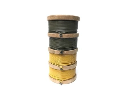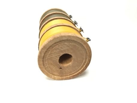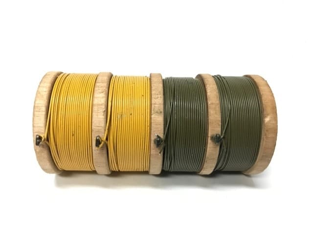 Wooden spool has 4 rolls of wire, 2 olive drab 2 yellow.