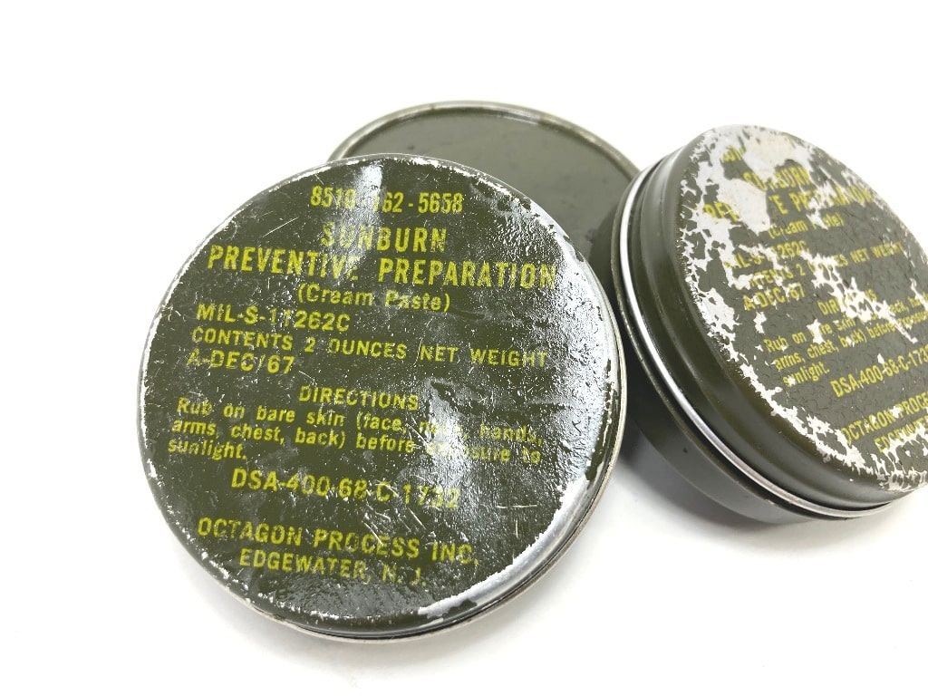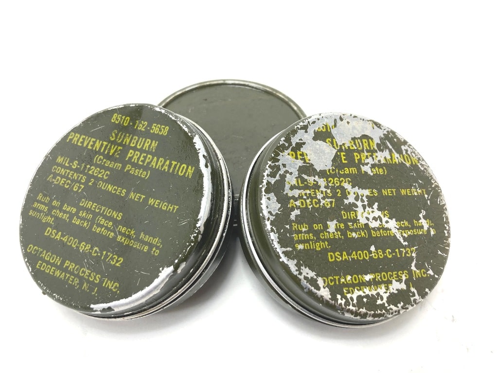 Found in most of the military survival and first aid kits during Vietnam, these sunburn preventatives have been through some rough storage and the cans are severely dented.