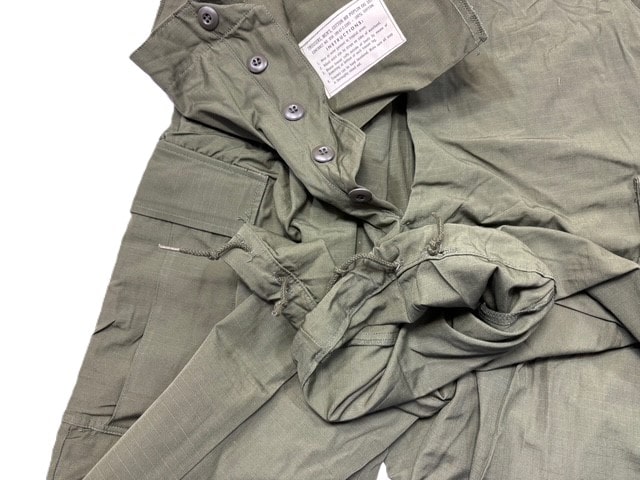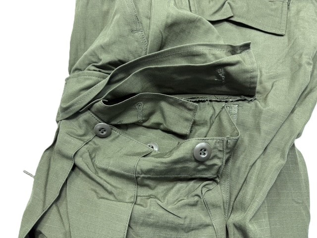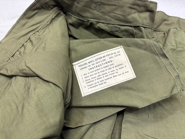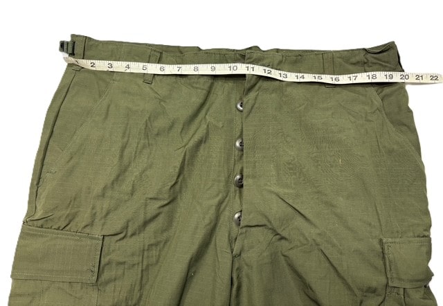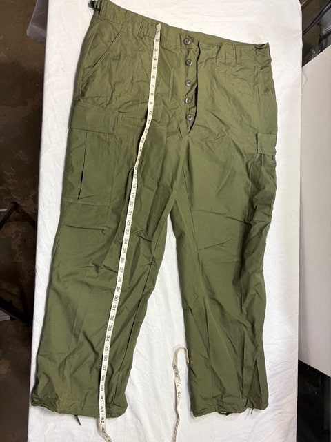 Button fly genuine military issue jungle fatigue pants from Vietnam War. NEW OLD STOCK. 1967 DATED. LARGE REGULAR by measurement, *no original sizing tag on pants* Hard to find size! Olive drab green 6-pocket trousers.