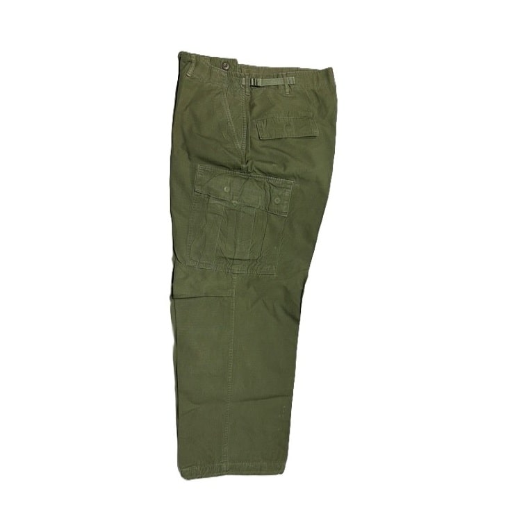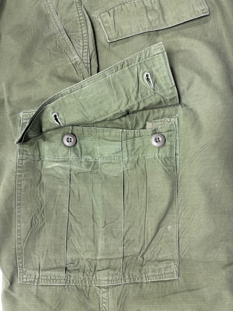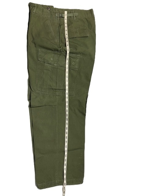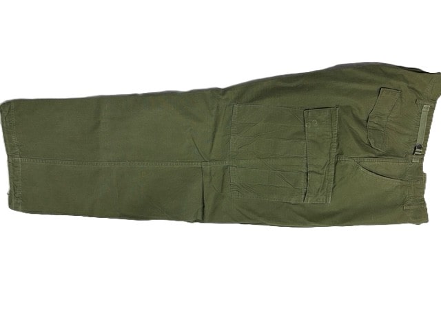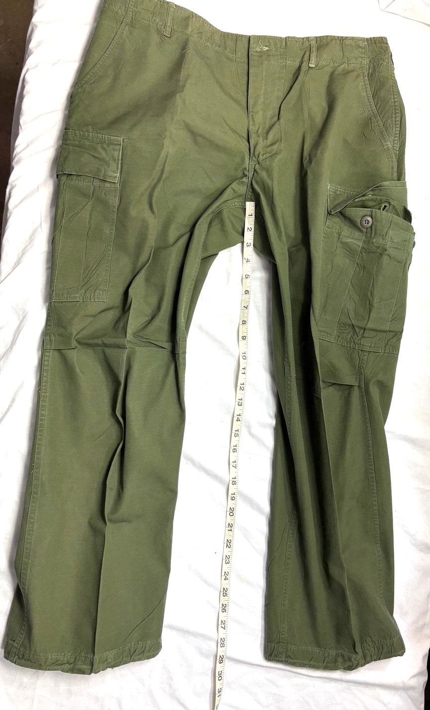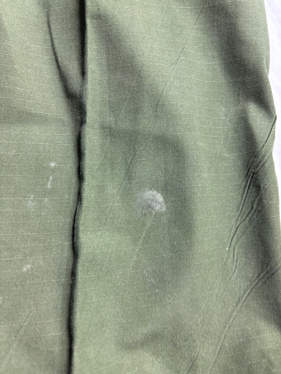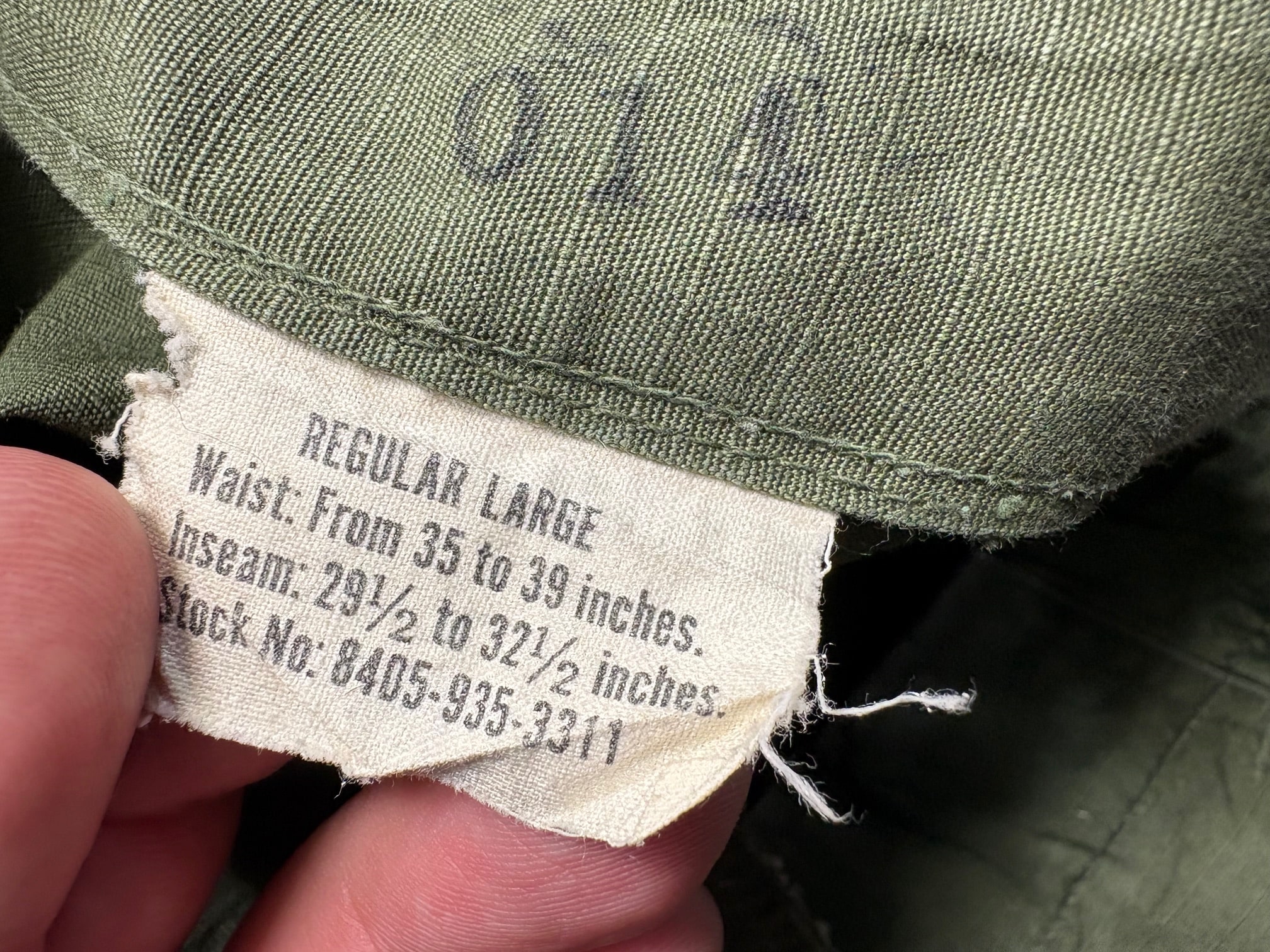 Zipper fly genuine military issue jungle fatigue pants from Vietnam War. Used condition. 1969 DATED. LARGE REGULAR* One tear on the pocket and two stains on the back legs. Sort of wax or glue staining the pants.
