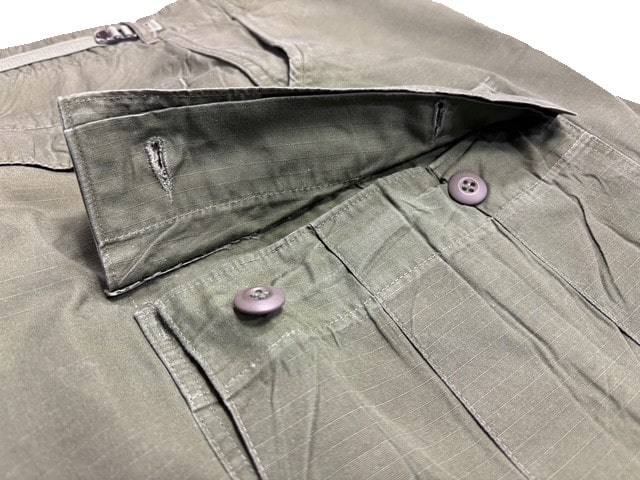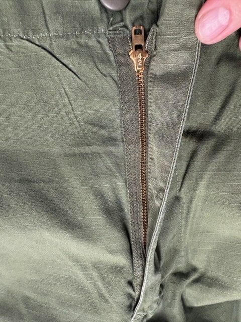 These are original brass zipper fly POPLIN RIPSTOP. Left side thigh pocket on trousers contains a hidden inner pocket which identifies these as the genuine article.