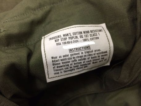 These are original 3rd pattern ripstop. Most are 60’s dated. They are new and un-issued. Left side thigh pocket on trousers contains a hidden inner pocket which identifies these as the genuine article. Note: XL fits a 39″-43″ waist, 29 1/2” to 32 1/2” inseam.