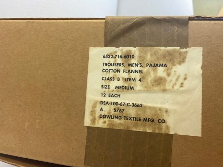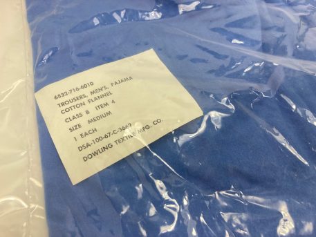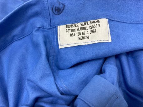 Warm and cozy Korea/Vietnam era dated cotton flannel pajama trousers. Loose-weave, lightweight, roomy and comfortable. Distributed to patients in hospitals, usually in the rear area and mostly in the interior zone outside combat. they were primarily for sleeping as convalescent suits were given out for daytime wear. They provided the wounded and recovering fighting personnel comfortable loose clothing to properly heal. New old stock with adjustable waist.
