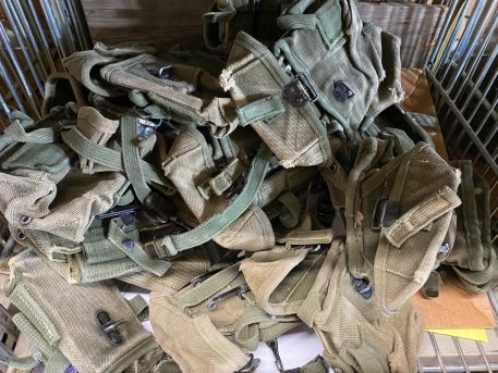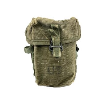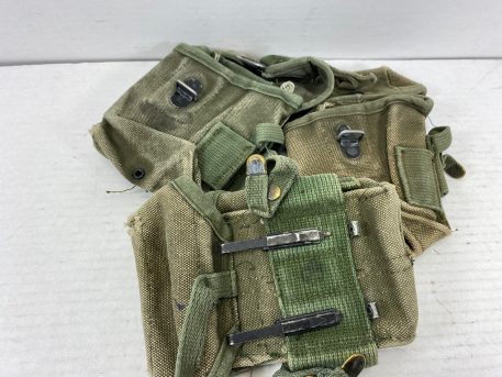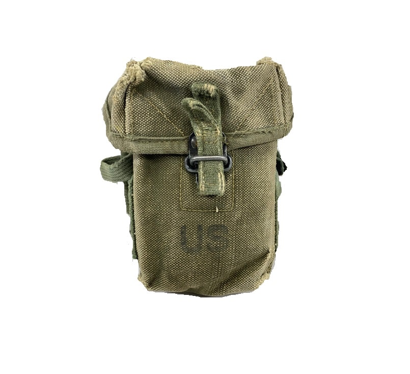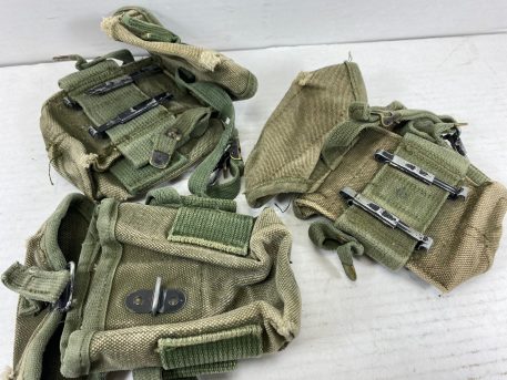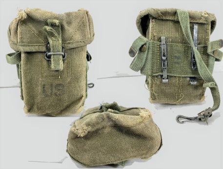 Heavy canvas mag pouch with canvas latch-thru metal secure tab. Holds two M-14 magazines or four 20rd M-16 magazines. These are in rough condition with a few minor parts and/or pieces that may be missing or defective. The latch works and for the most part it is good for its intended purpose of carrying magazines or other small supplies. Expect lots of fraying on the canvas and discoloration.