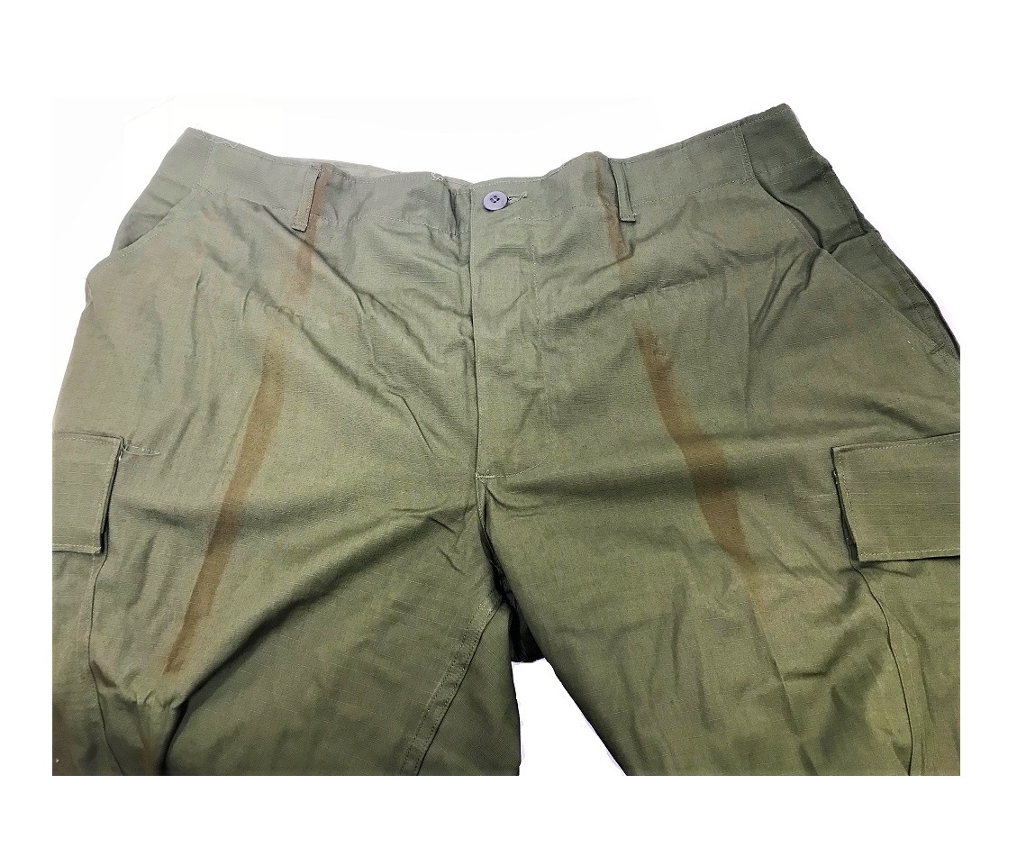 They have been stored in the original weather and mildew proof cardboard cases since 1969, but with time they are now stained brown in various places wherever the material was touching the box. It does not appear that the staining has caused any damage besides a discoloration. Our loss is your gain as we have priced this original issue trousers accordingly. These are the real deal, all new but stained. Closeout price, sold as-is. Sorry, no returns on these.