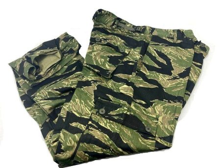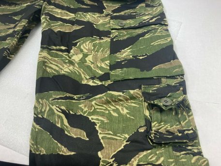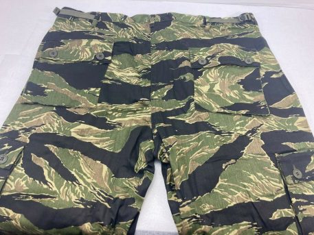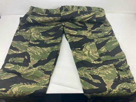 Manufactured by “Tigerstripe Products” in the early 1980’s. New old stock factory seconds. 100% cotton twill— NOT RIPSTOP—. Most have had the label marked out. These were manufactured before they started using a Vat-dying process and because of this they will fade extremely fast and also in varying degrees depending on the dye-lots. Button colors will vary, some are brown and some are green with button fly. Remember …these are factory seconds and will fade unevenly. Cannot guarantee color matches, brown and green variate from pants to pants. New old stock