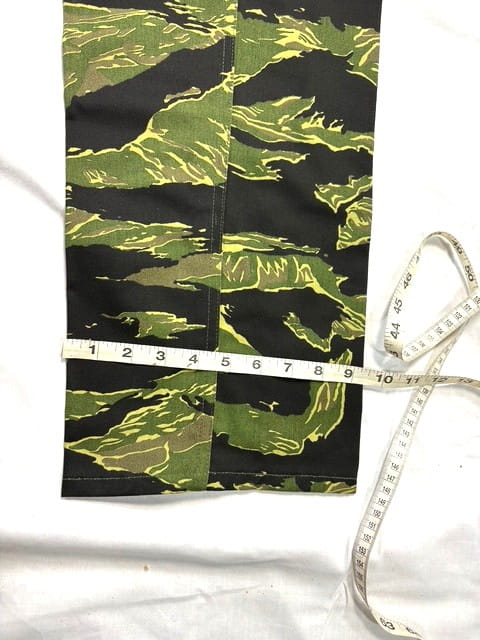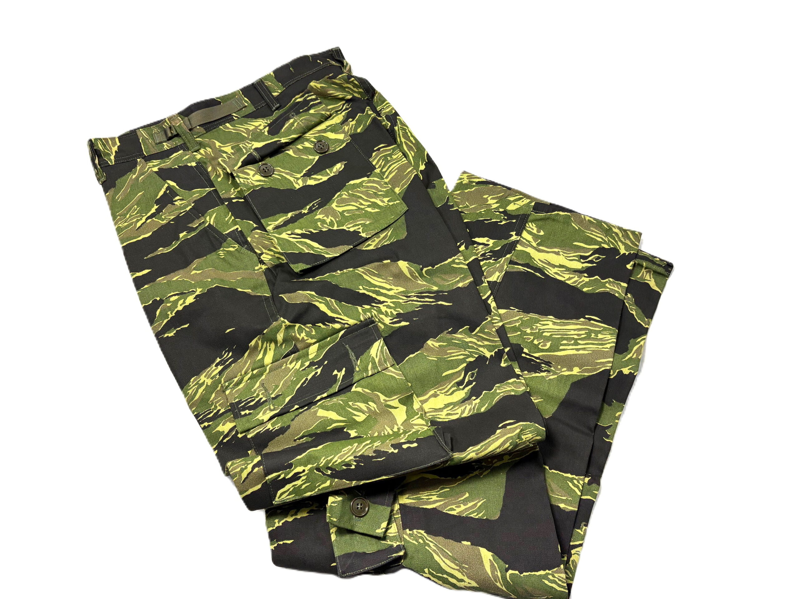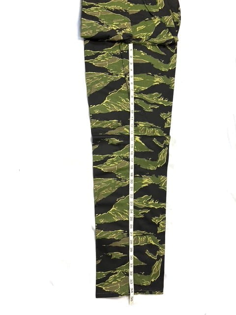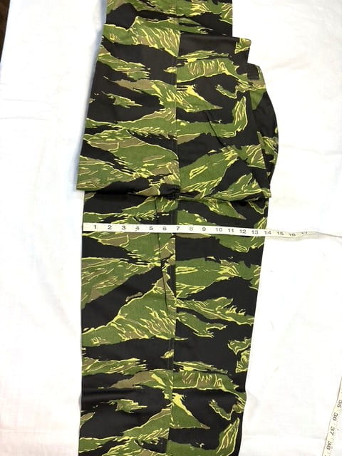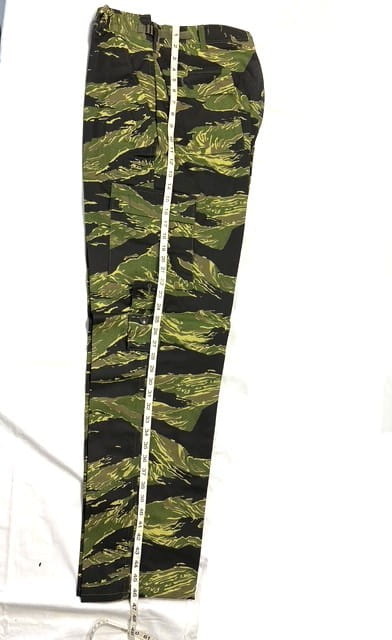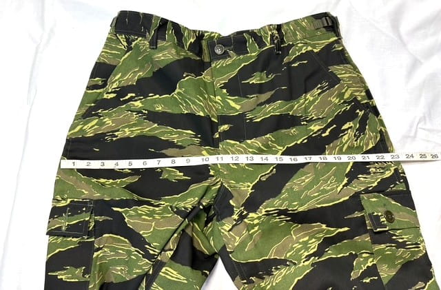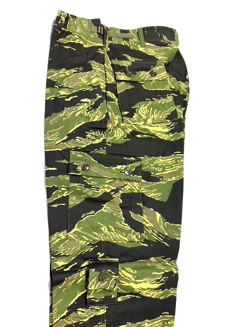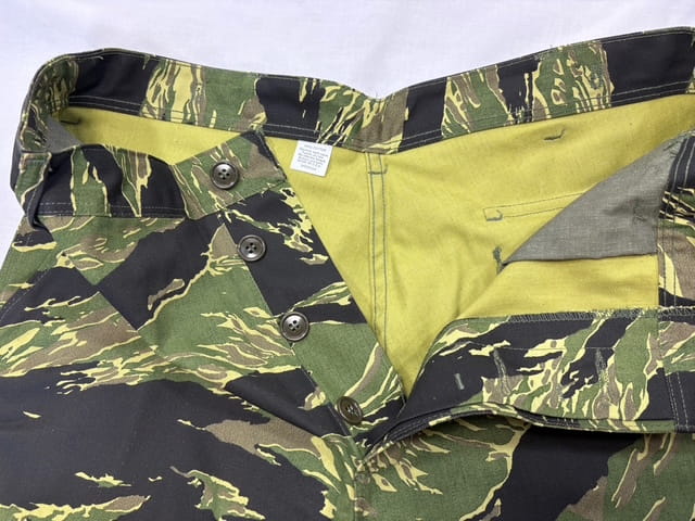 Vietnam Tigerstripe Pants. Manufactured by “Tigerstripe Products” in the early 1980’s. New old stock factory seconds. 100% cotton twill— NOT RIPSTOP—. Most have had the label marked out. These were manufactured before they started using a Vat-dying process and because of this they will fade extremely fast and also in varying degrees depending on the dye-lots. Recommended cold water wash and hang dry.