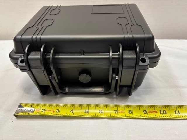 Approx 10 x 8 x 5 outside dimensions. Hard plastic container with handle and locking latches.