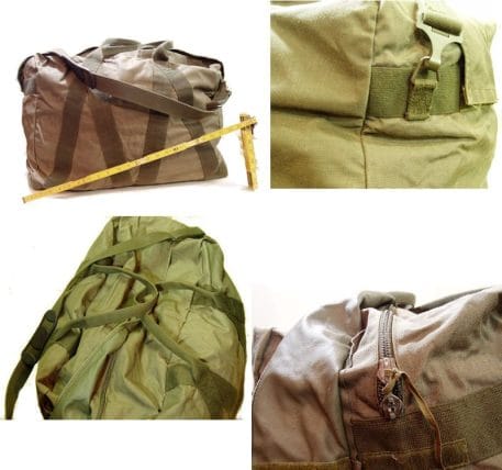 Used, but in fair-good condition with some minor surplus scrapes and bruising. All parts and pieces are intact and functioning. German duffle bag.