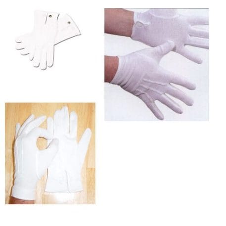 White Parade Gloves. Cotton stretch to fit white military style parade dress glove. Perfect for honor guard or inspection duty. Import copy of the original military issue. Quality is fair.