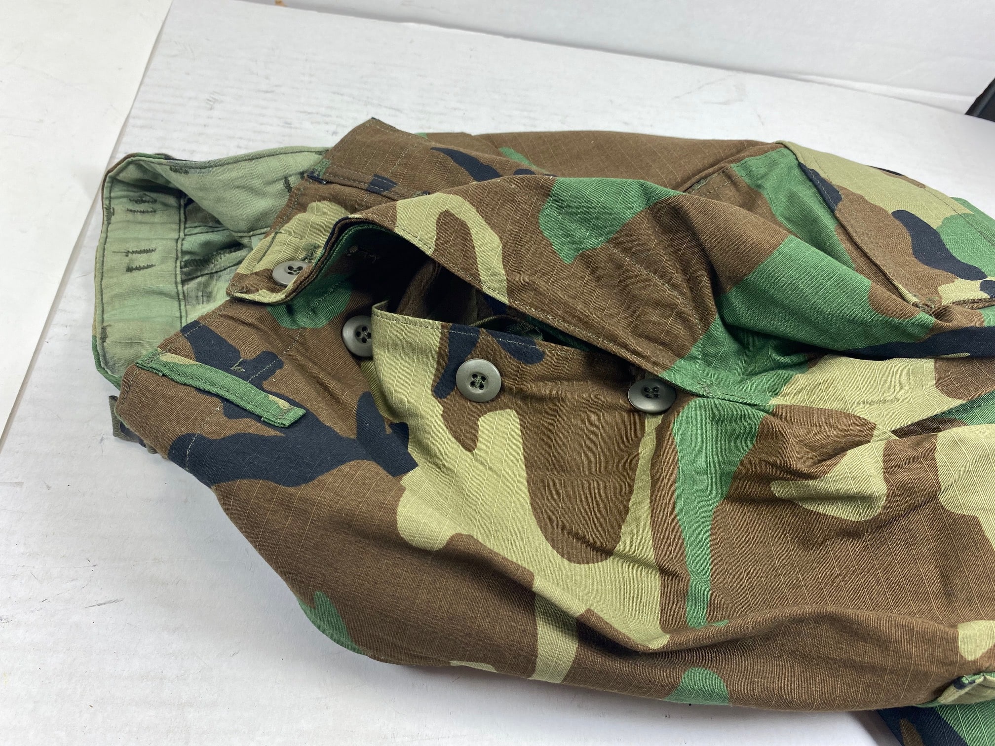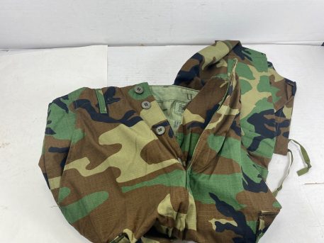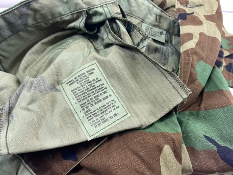 Original woodland 100% cotton ripstop bdu pants. Made by Quality Apparel Mfg Inc. 1987′ issue. Hot Weather Trousers. Inseam 32 1/2 inches to 35 1/2 inch. Button fly. Waist up to 27 inches.