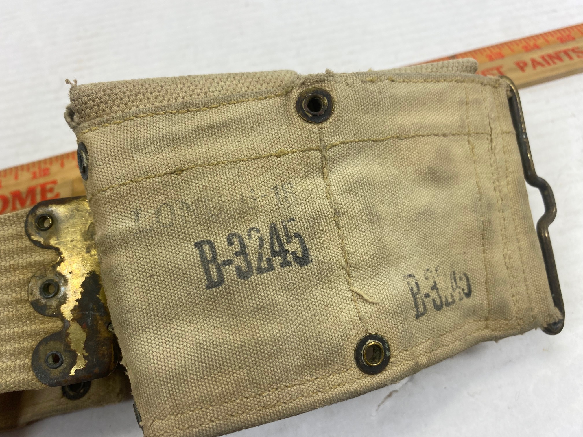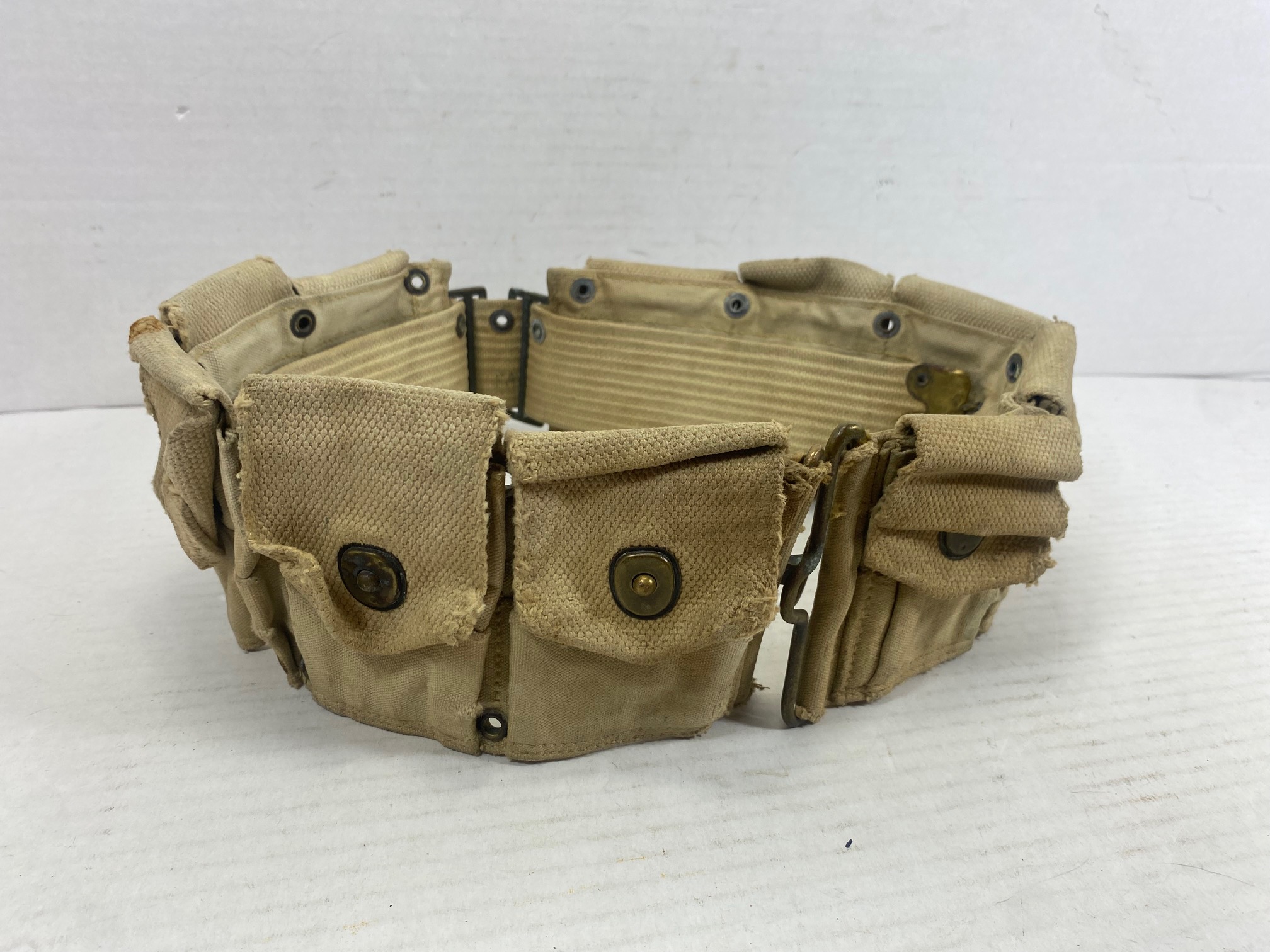 1 only used condition World War 1, 10 pocket cartridge belt. Dated 1918. Lots of fading, scuffs on canvas, all snaps work!