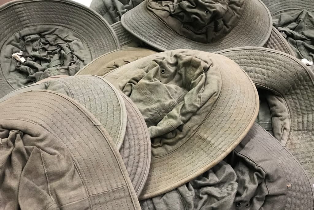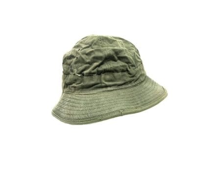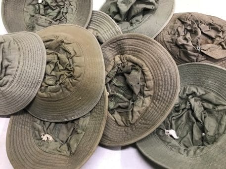 These are WW2 Herring Bone Twill (HBT) sun hats. Constructed of an all cotton, heavy olive drab material. Used with plenty of wear and tear. some small holes and repairs and stains. Priced to move-out. but would be a great addition to any WW2 collection. ALL X-SMALL. You can buy 1 better condition for $10.