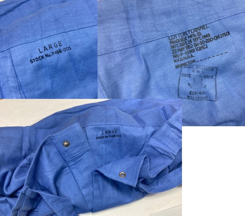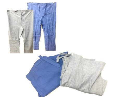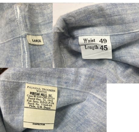 2 available options. Dark crisp Korea War dated Blue pajama trousers, or a discounted WW2 dated Grey pajama trousers with stains from packaging and storage. (see photos) These are cut BIG! 45 waist on the Korea War Blue, 49 waist on WW2 Grey!