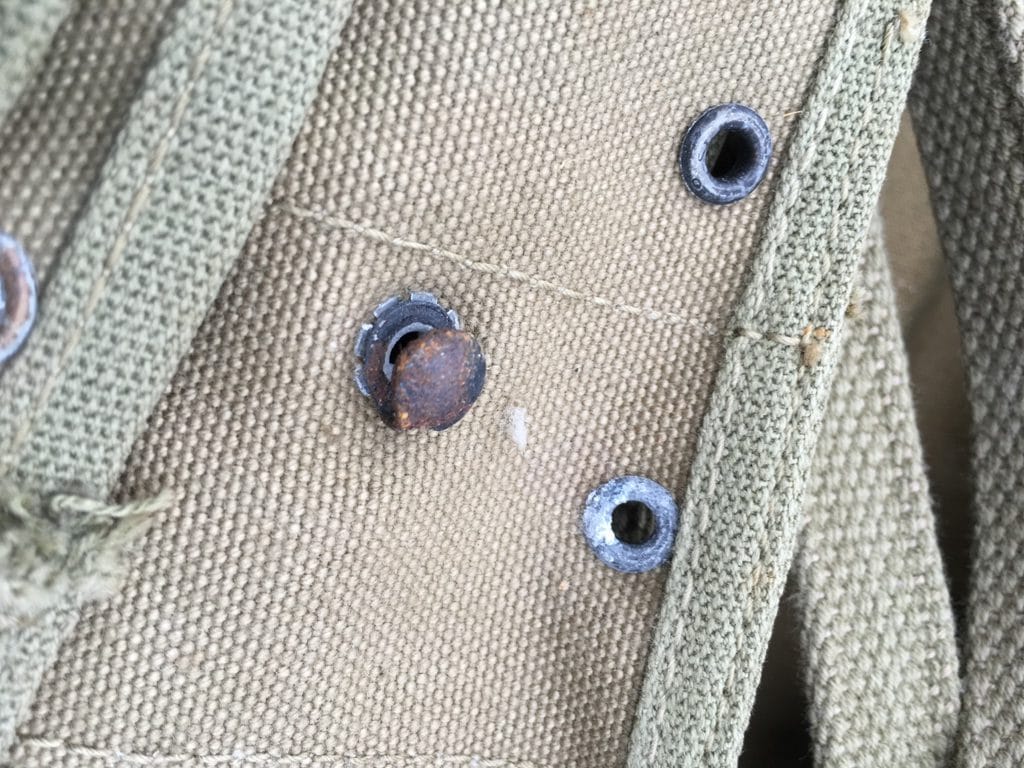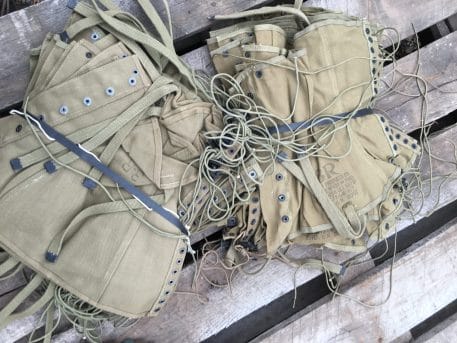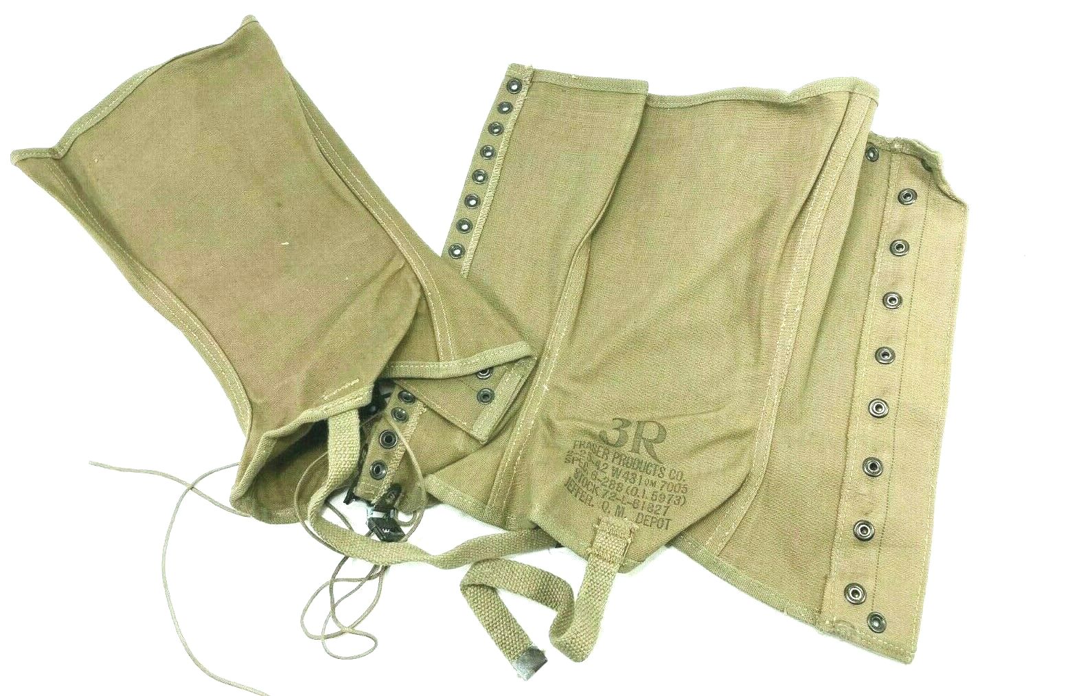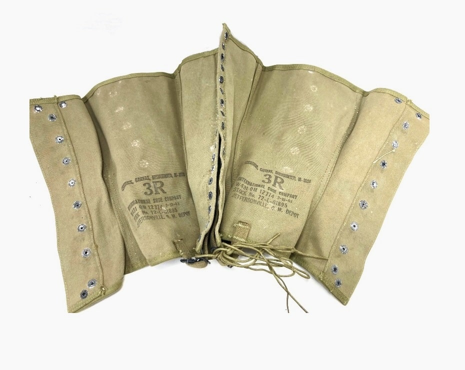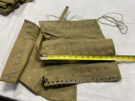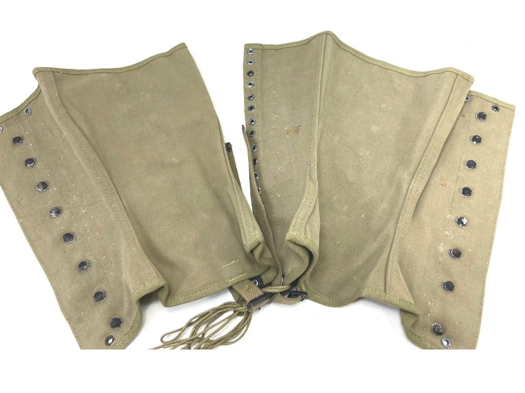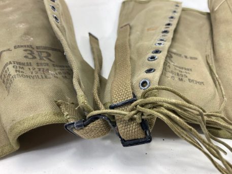World War 2 military issue boot leggings. These were worn by US forces in WW2. The spats were worn over the low top boot to help protect from dirt, mud, bugs and crud. No world war two uniform is complete without a pair of these. Leggings are “New Old Stock” and in fair condition, with rust and staining. All WW2 dated with various manufacturers. All khaki with original laces included. Most dated in 40’s. All size 3 (about 16″ calf circumference) New WWII Surplus. .