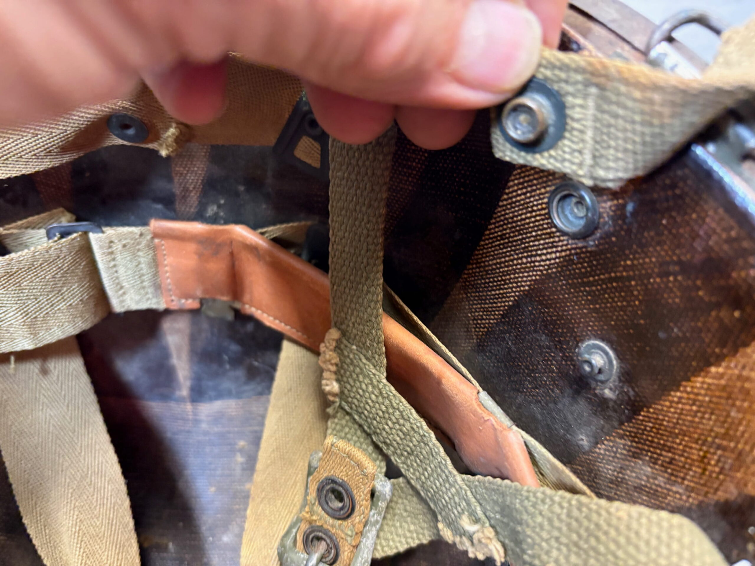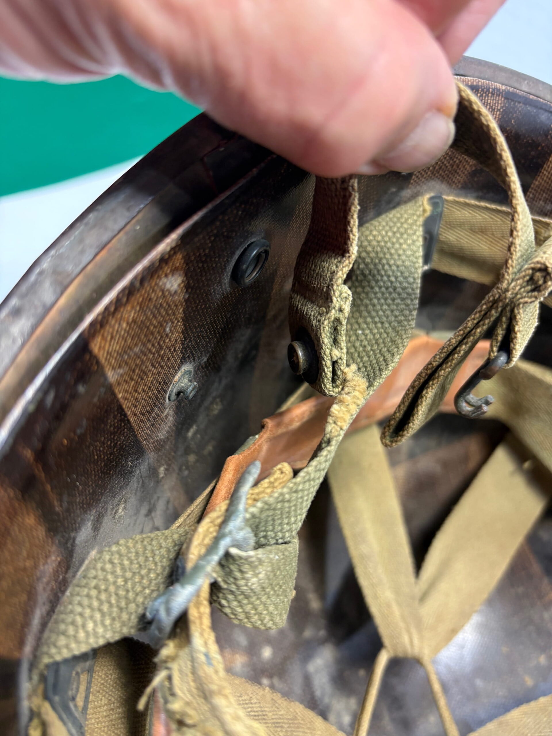 WW2 M1C Paratrooper Helmet comes complete with steel pot and liner (Westinghouse). Liner has sweatband, nape strap, and paratroop chinstrap. Steel pot also comes with cotton chinstrap. All original WW2.
