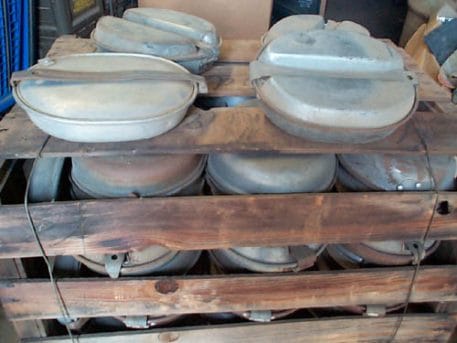 Early issue aluminium galvanized mess kits.WWII dated aluminum with galvanized handle-$29.50. WWI dated aluminum with galvanized handle and brass hinge-$39.50